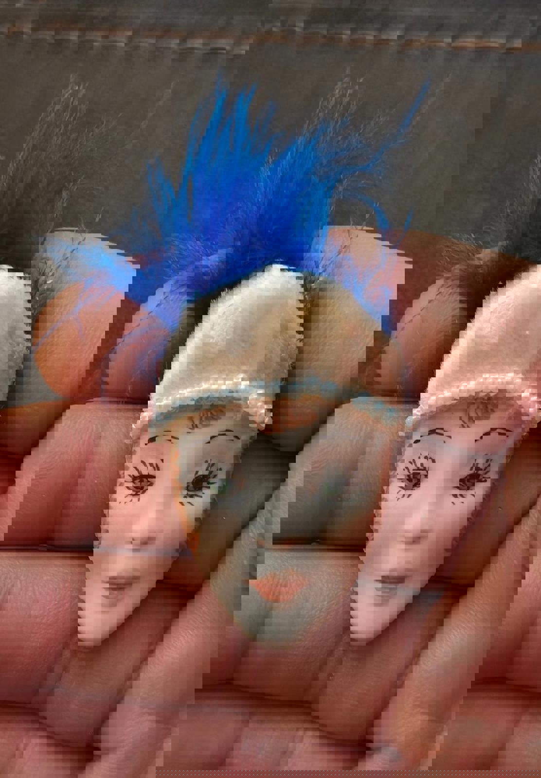 It measures approximately 2 1/2" tall including the feather. This brooch is a type of costume jewelry known as chalkware, which was popular in the early 20th century. It features a hand-painted doll face with faux pearls and feathers.