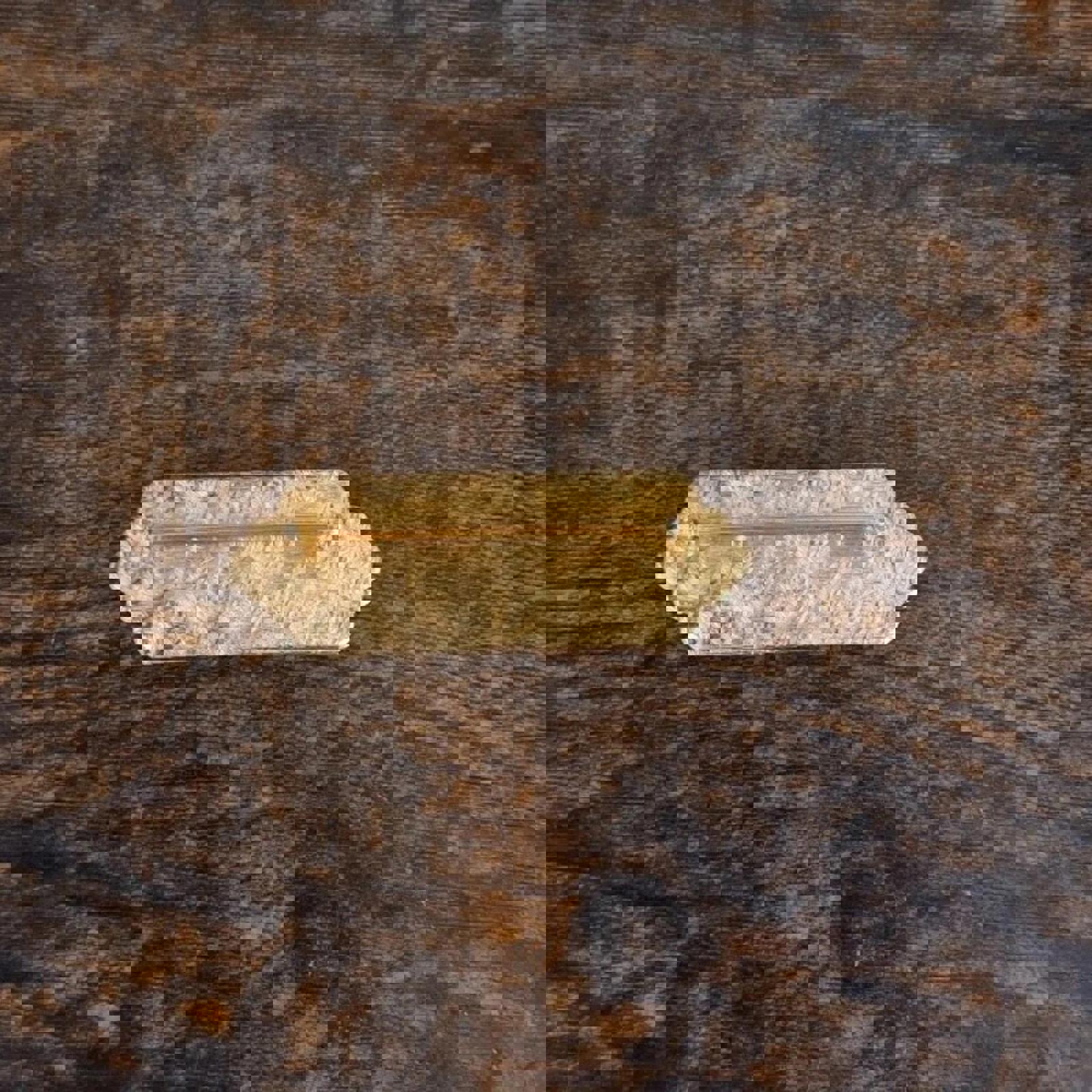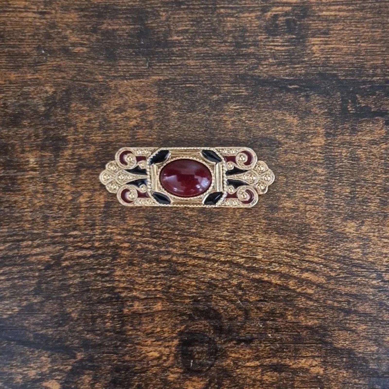 This 1928 Brand Gold Tone Red Lucite Cab Bar Brooch Pin is in Great condition. It measures approximately 2.3' in width and 0.8' in length. It features a gleaming gold tone finish with intricate detailing on the edges that adds an extra layer of visual interest to this piece. The centerpiece of the brooch is a vibrant red lucite cabochon that is beautifully faceted to catch the light and create a sparkling effect. The back has a textured swirl pattern apparent on 1928 costume jewelry.