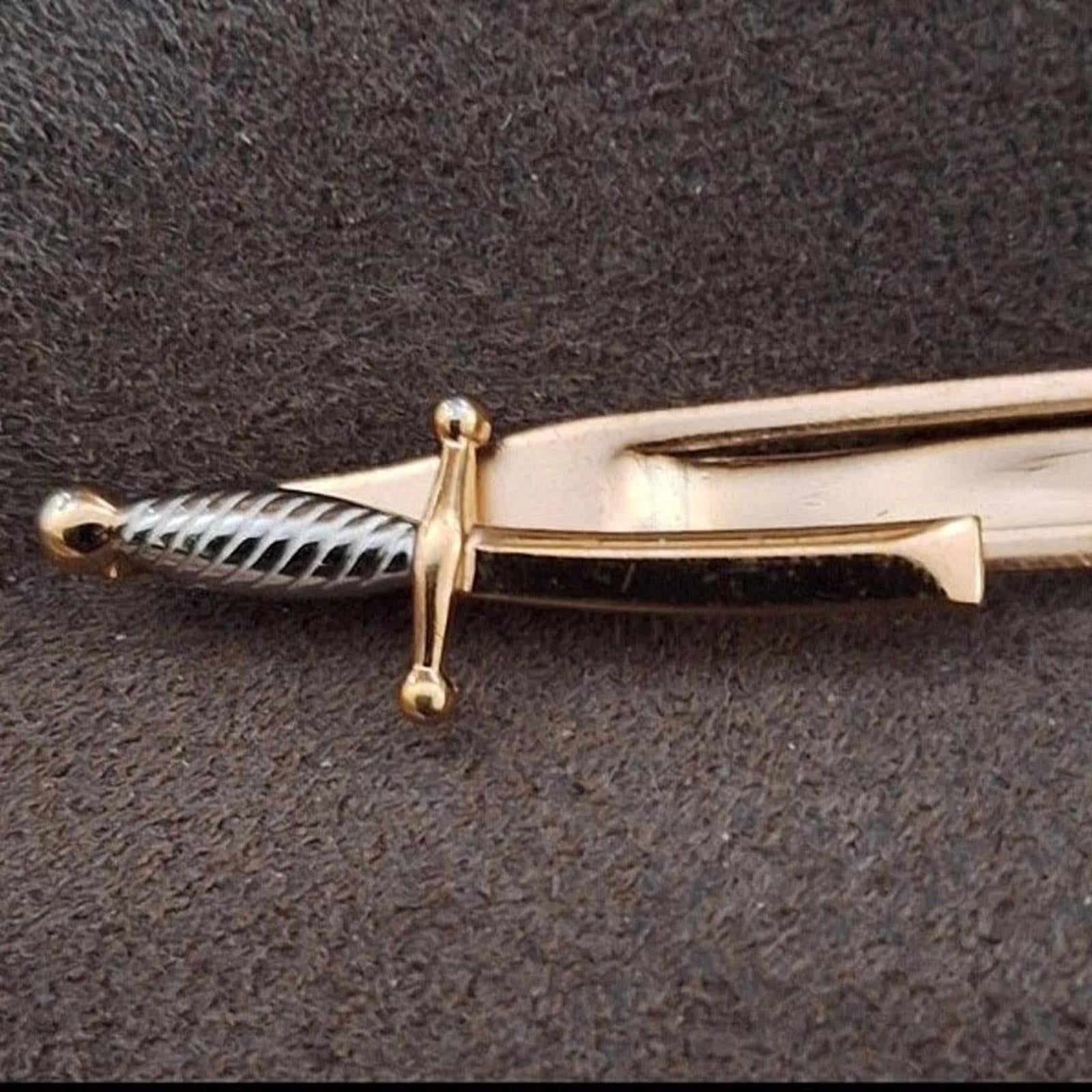 Tie clip measures approximately 3 1/2" long and marked Swank in the back. Shiny brass plated metal with silver tone textured handle accent. Creates the illusion that the sword is piercing the tie. Very cool!!