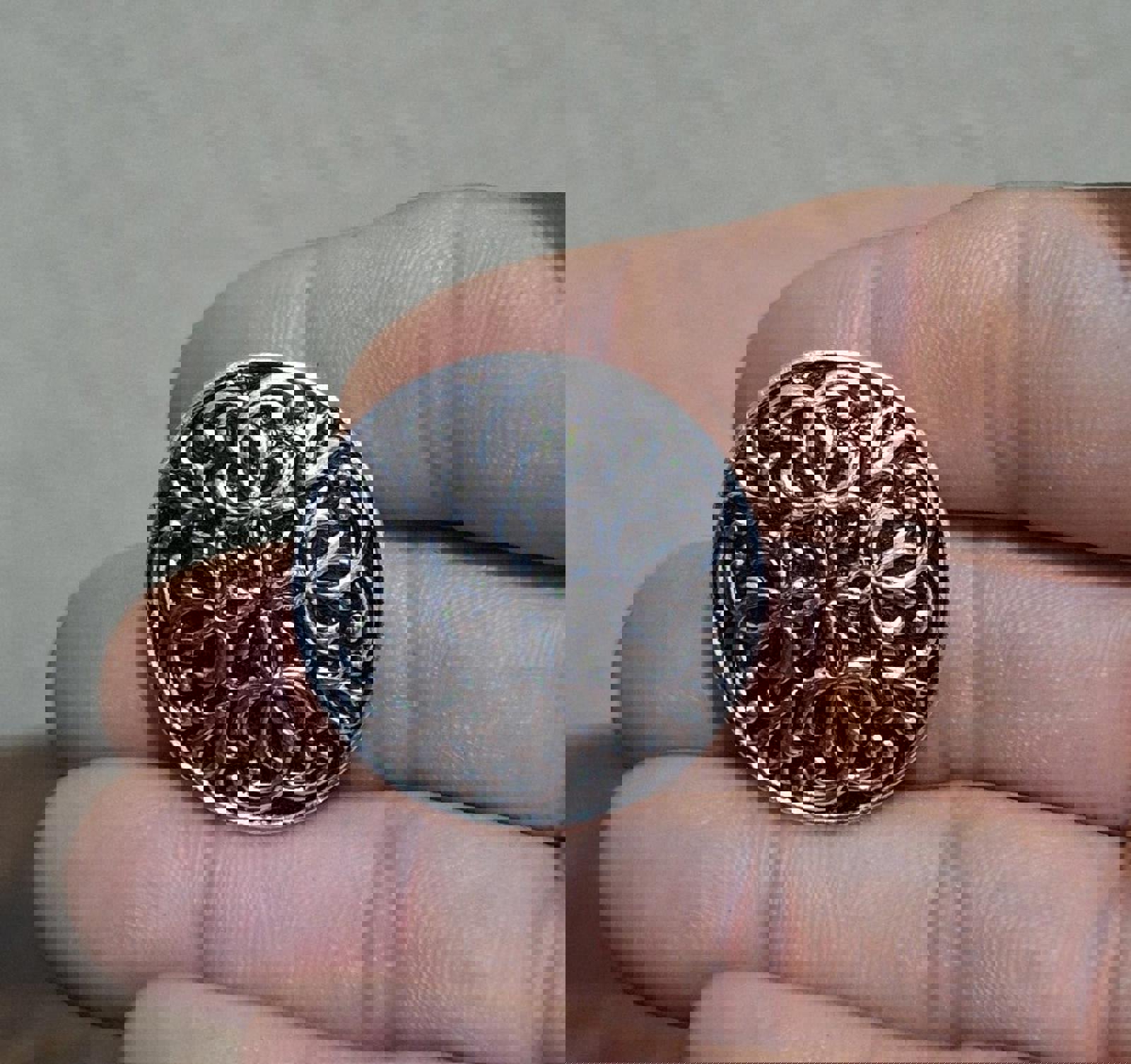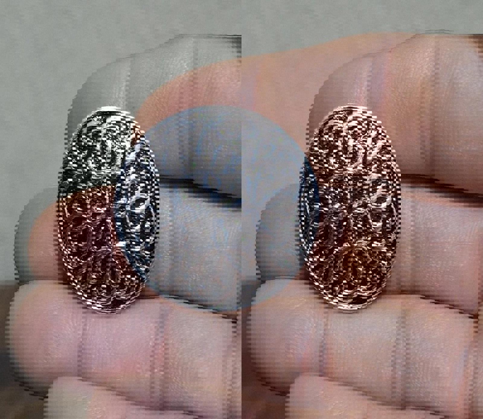It measures approximately 1.25" in diameter. It features a silver and black color scheme with an art deco design. The raised textured detail show its quality and charm. Marked W. Germany in the back.