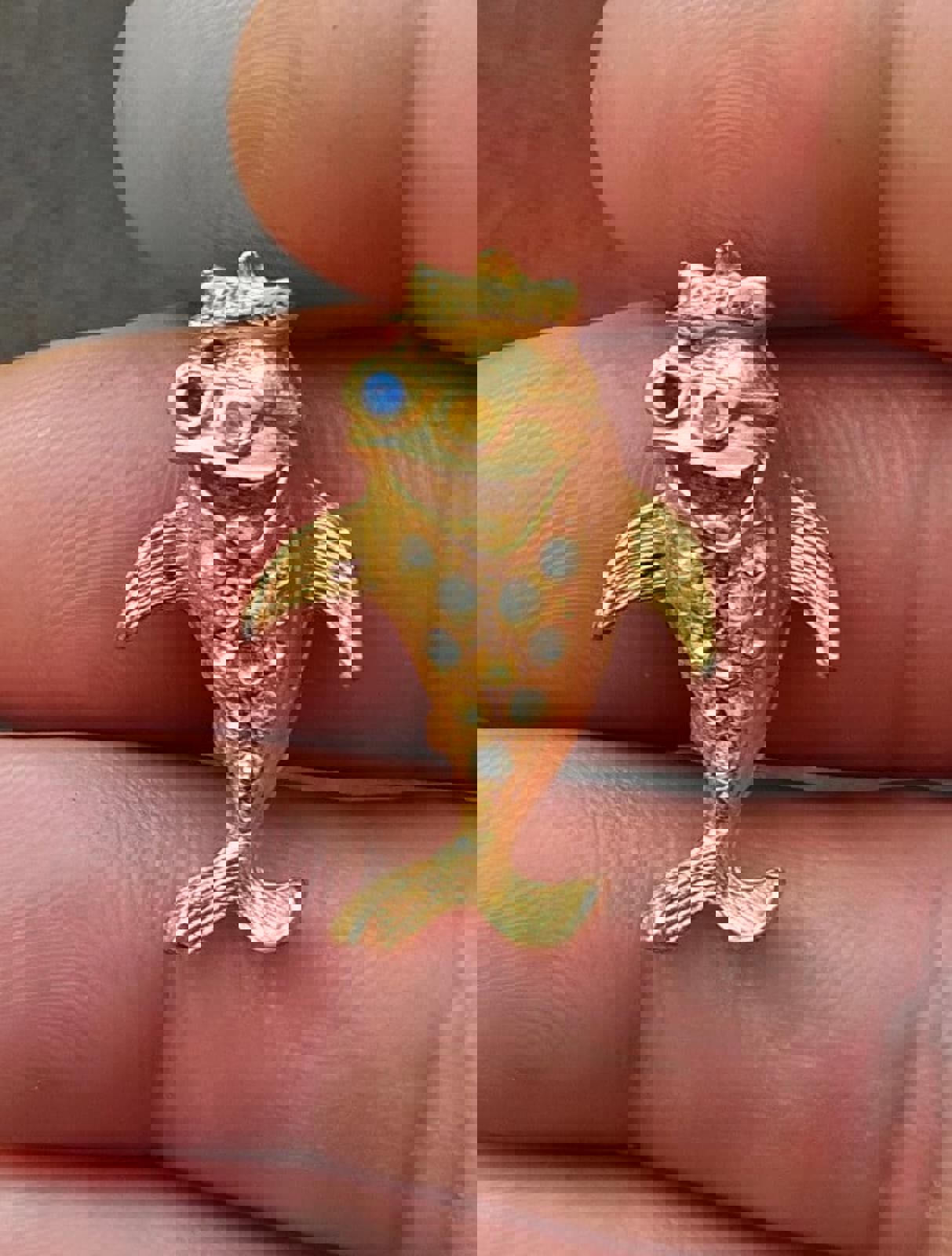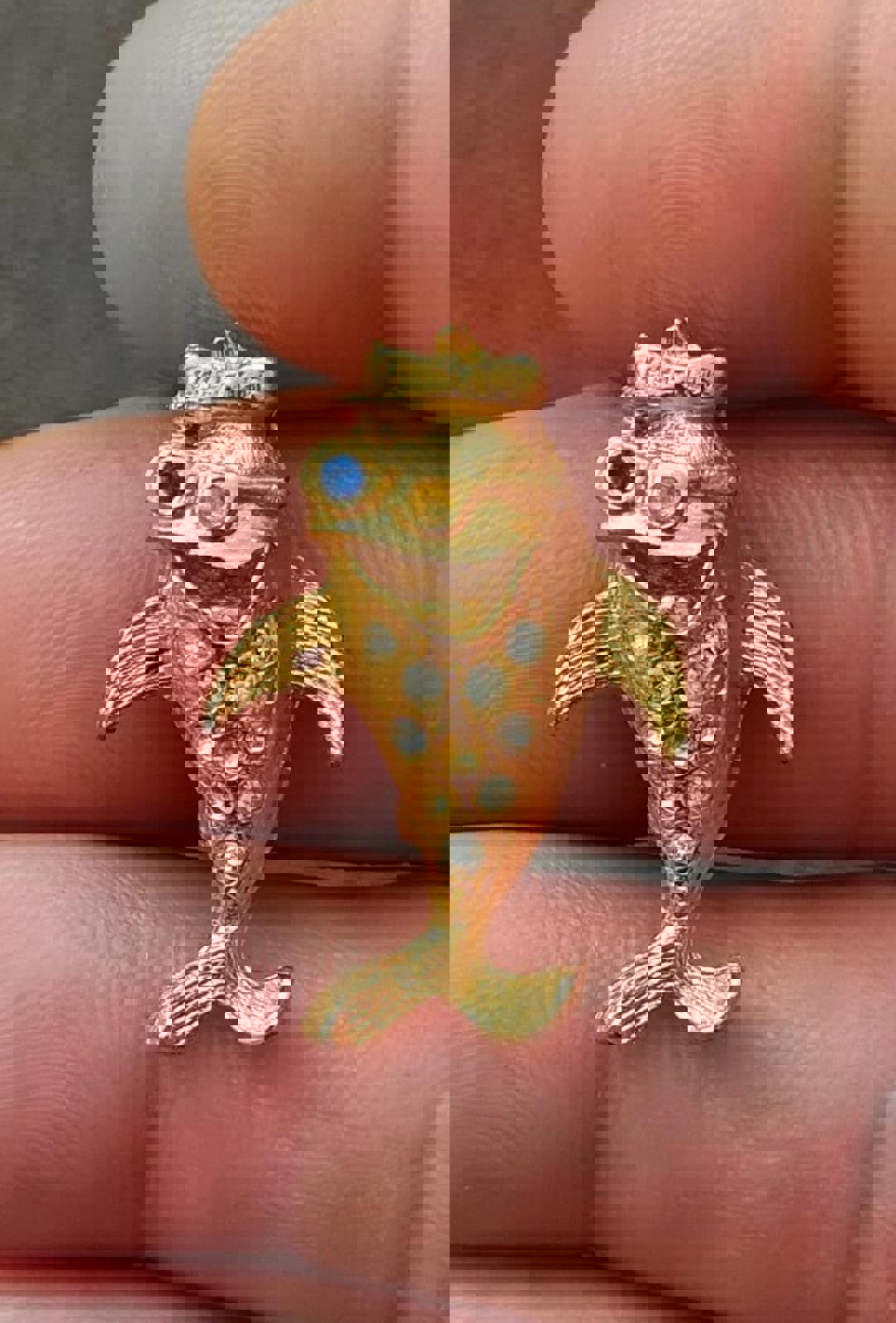 It measures approximately 1.25” tall × 0.75” wide. This charming vintage Charlie the Tuna lapel pin features the beloved StarKist mascot in gold tone metal, complete with his signature glasses and jaunty hat. A fun piece of mid-century advertising memorabilia, it’s a perfect addition to any collection of retro food brand promos, TV mascots, or vintage enamel pins.