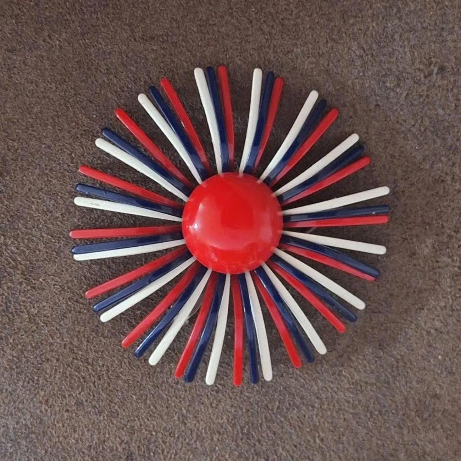 This Great Vintage 1960s Red White & Blue Patriotic Starburst Fireworks Brooch Pin is in Excellent Condition.