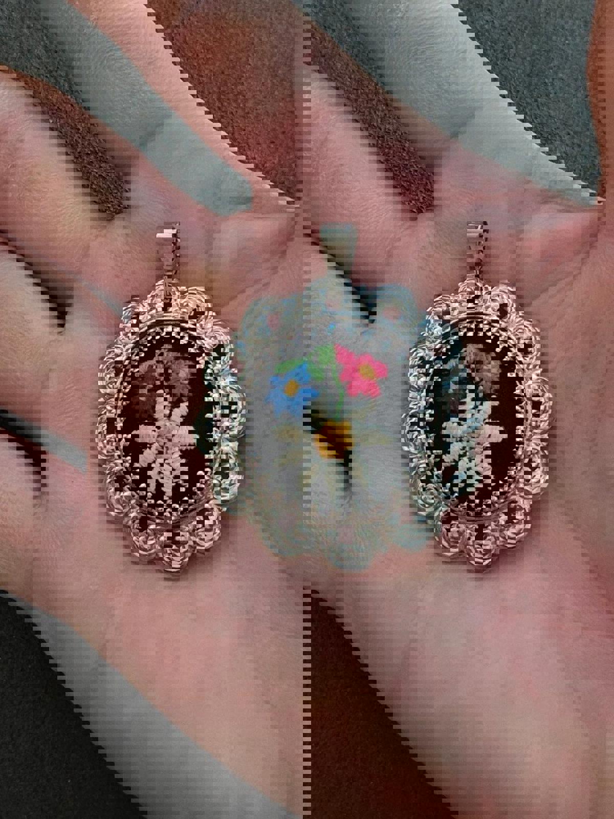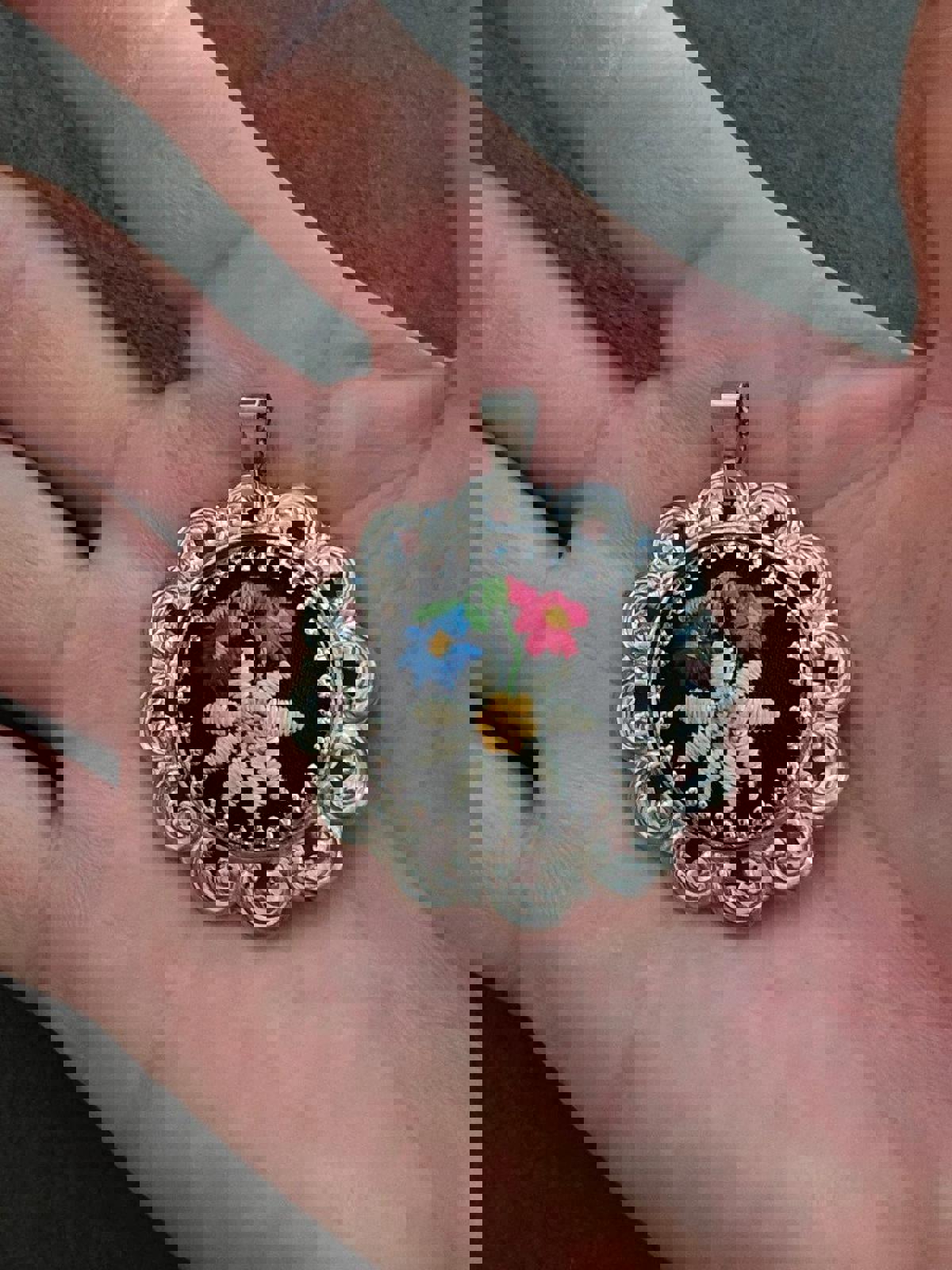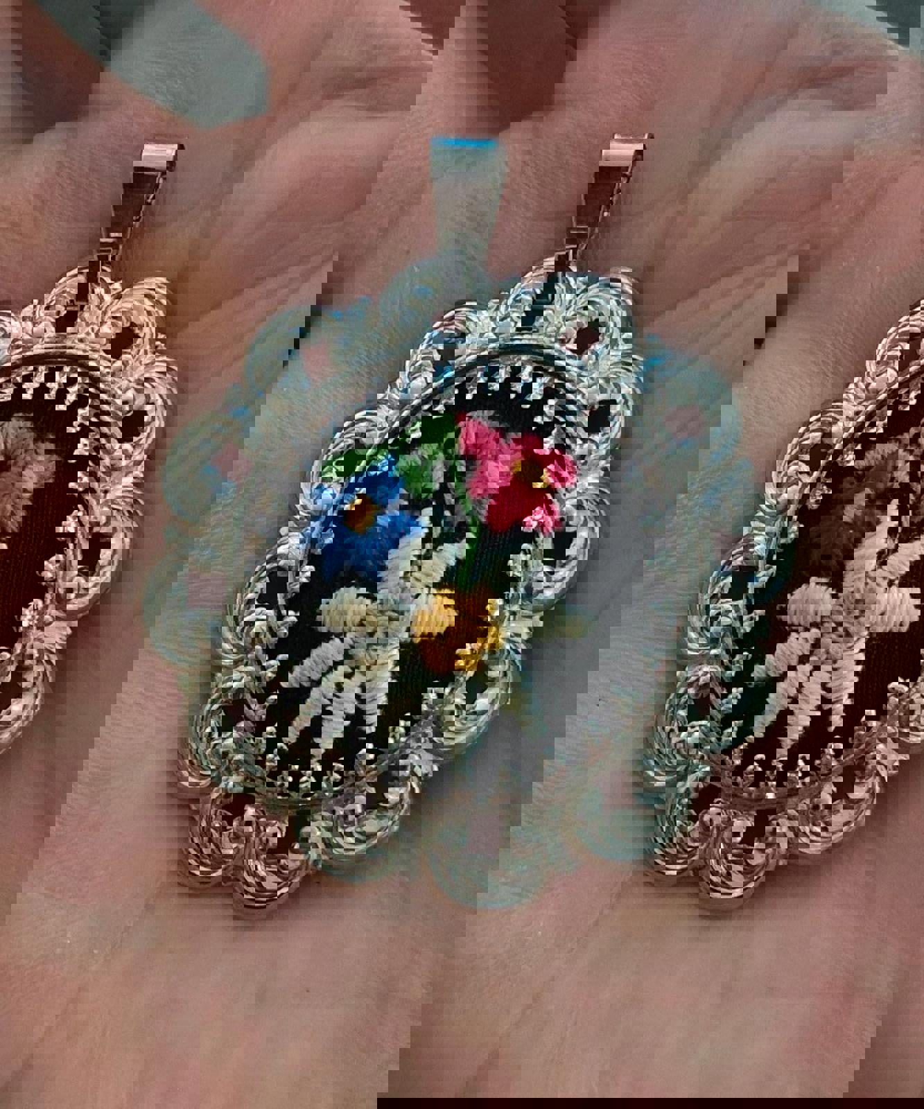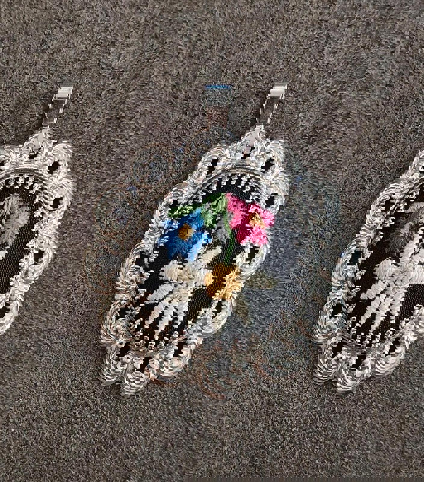 It measures approximately 2" tall. This hand stitched cross-stitched Victorian style pendant is beauty and elegance all in one. Three flowers on black fabric. Main flower features white petals with a yellow center, two smaller flowers on bottom in fuchsia pink and blue. They are centered on a beautiful silver tone base with filigree detail all around. Very elegant pendant with great detail