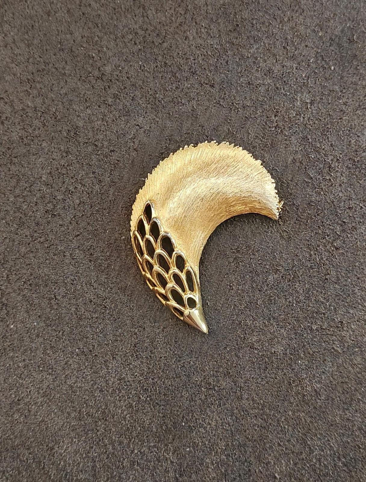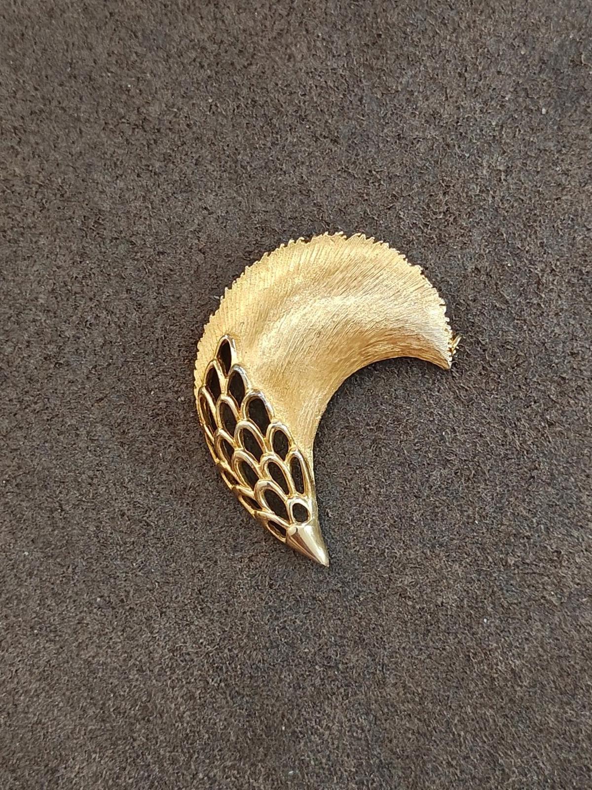 1970's Signed J.J. Gold Tone Textured Feather Plume Brooch Pin
