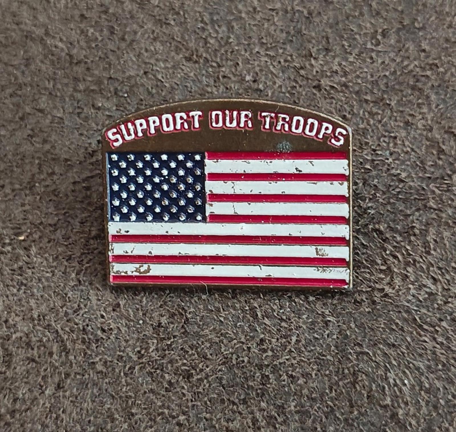 It measures approximately 1 1/4" x 1". It features the American Flag and the words support our troops. Show your patriotic spirit with this great vintage pin.