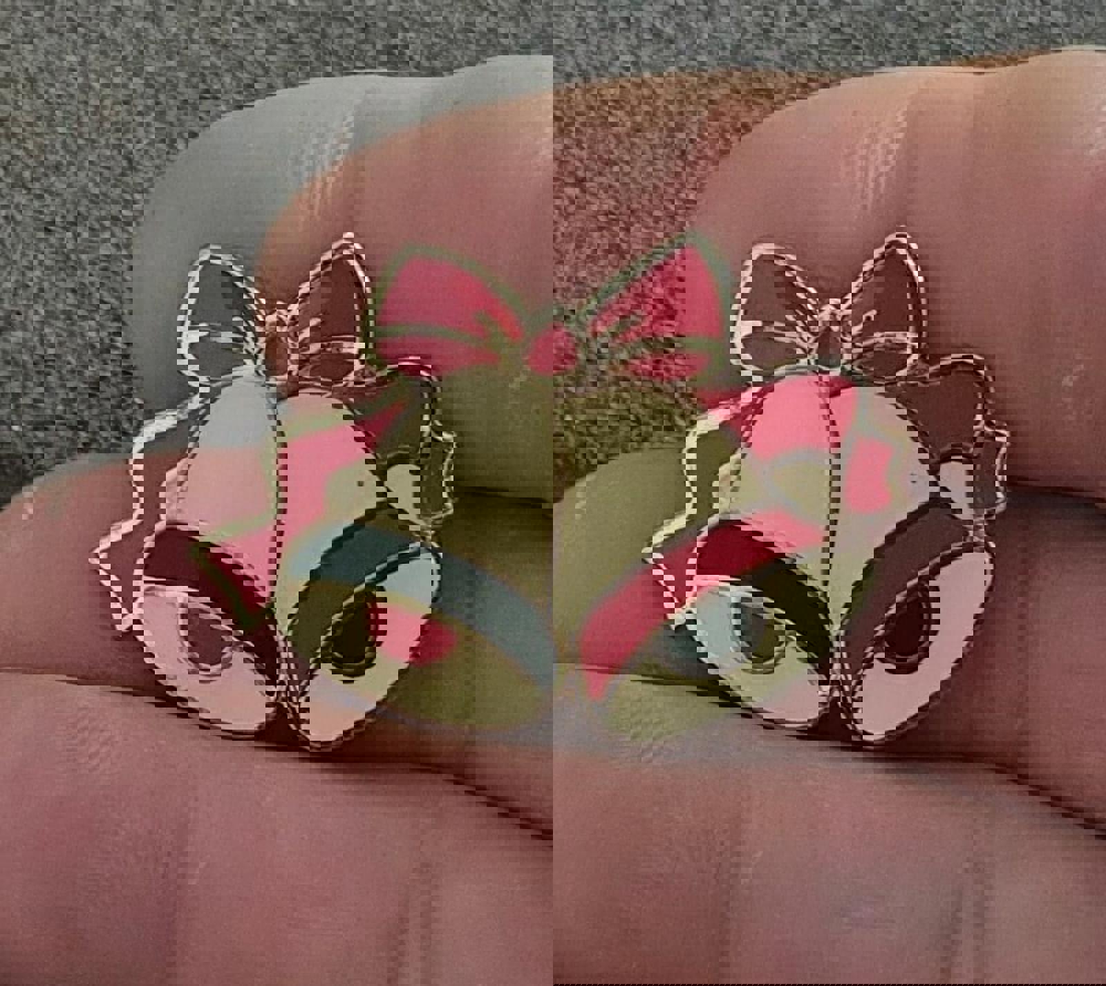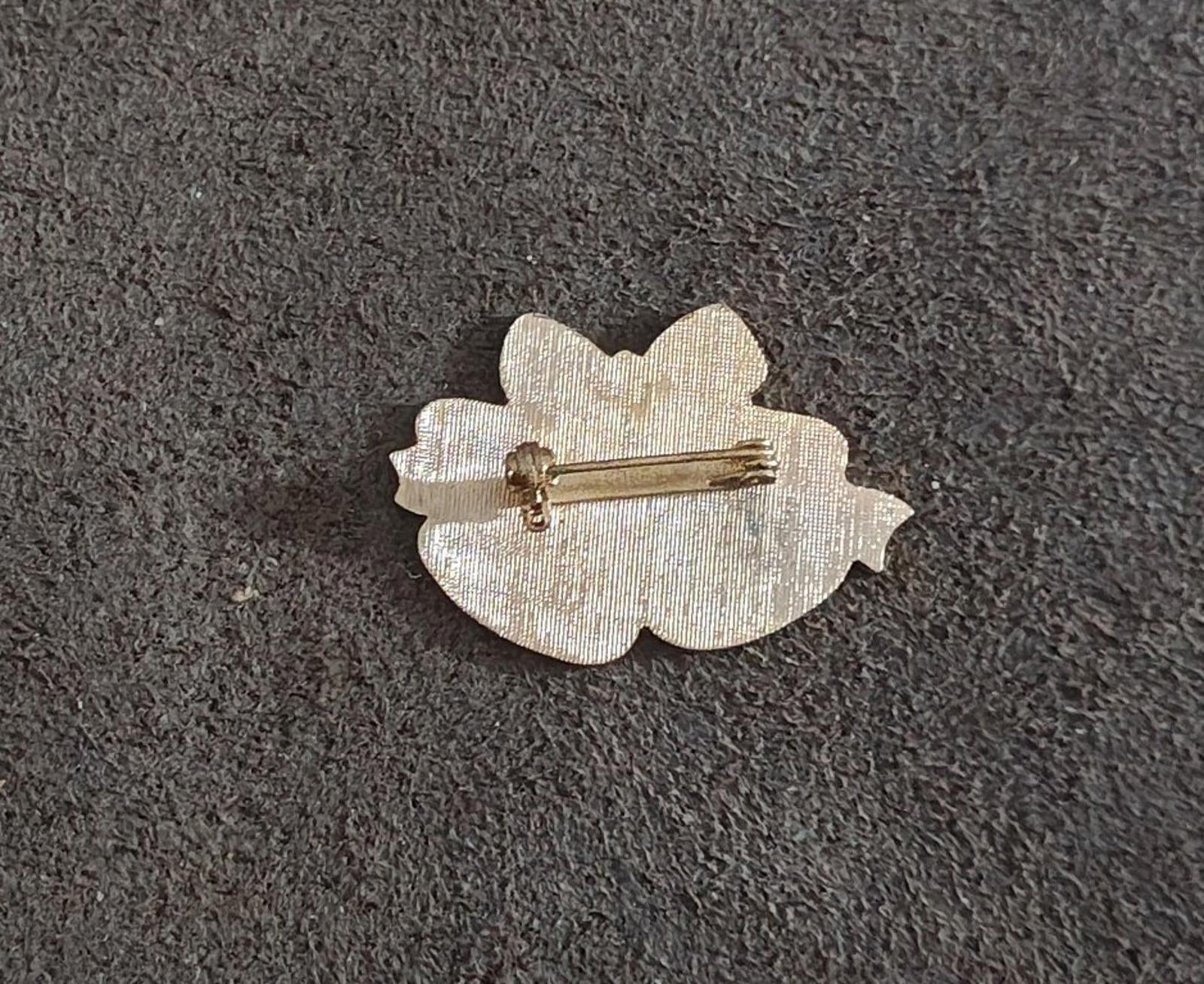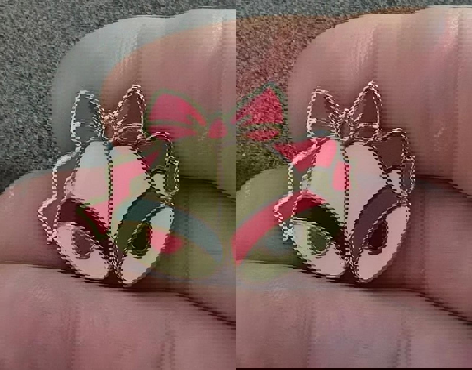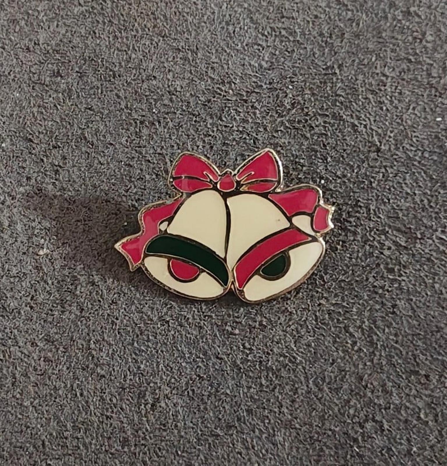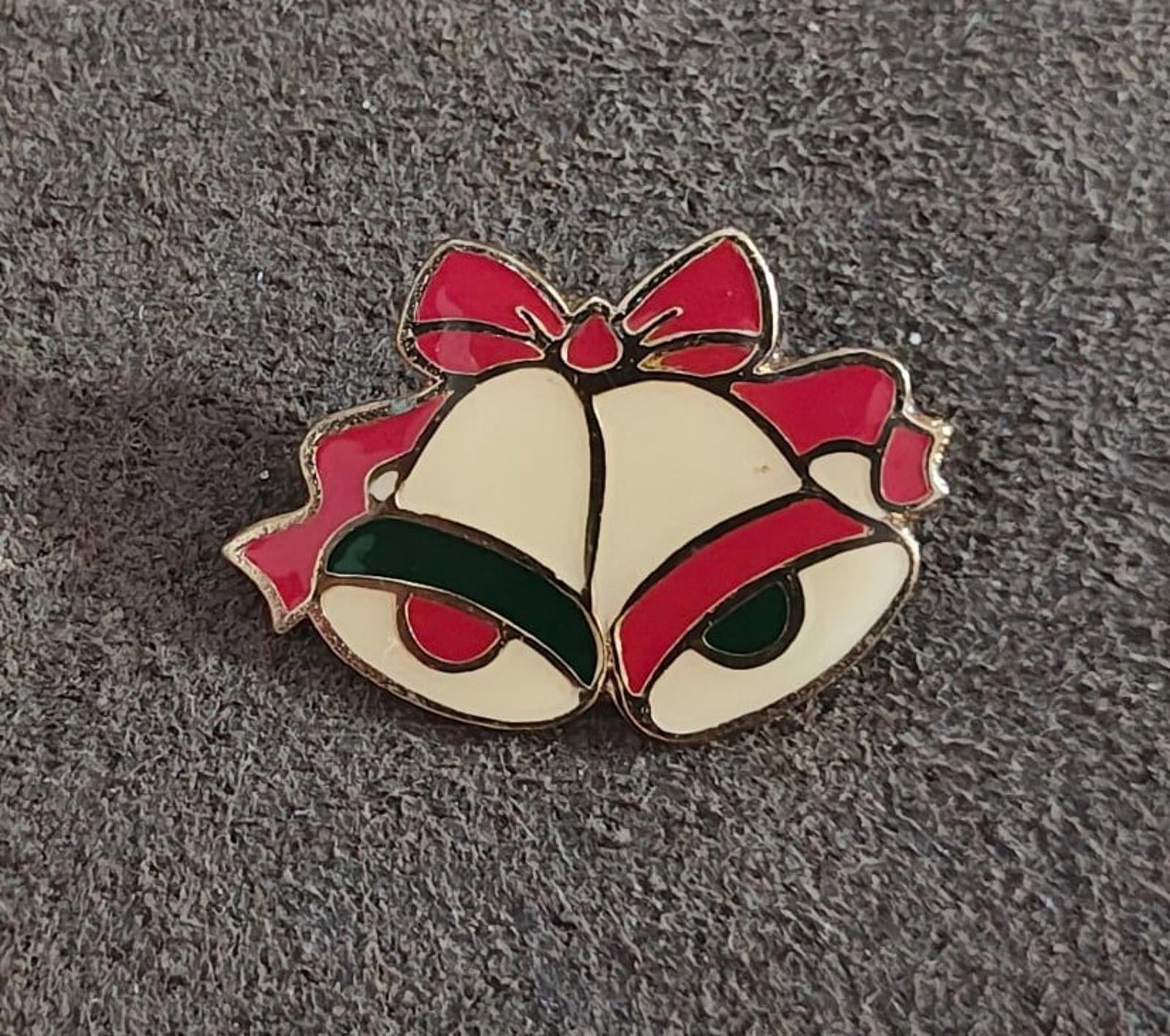 This lovely brooch features a pair of Christmas bells adorned with a red bow. The bells are accented with red, white, and green enamel.