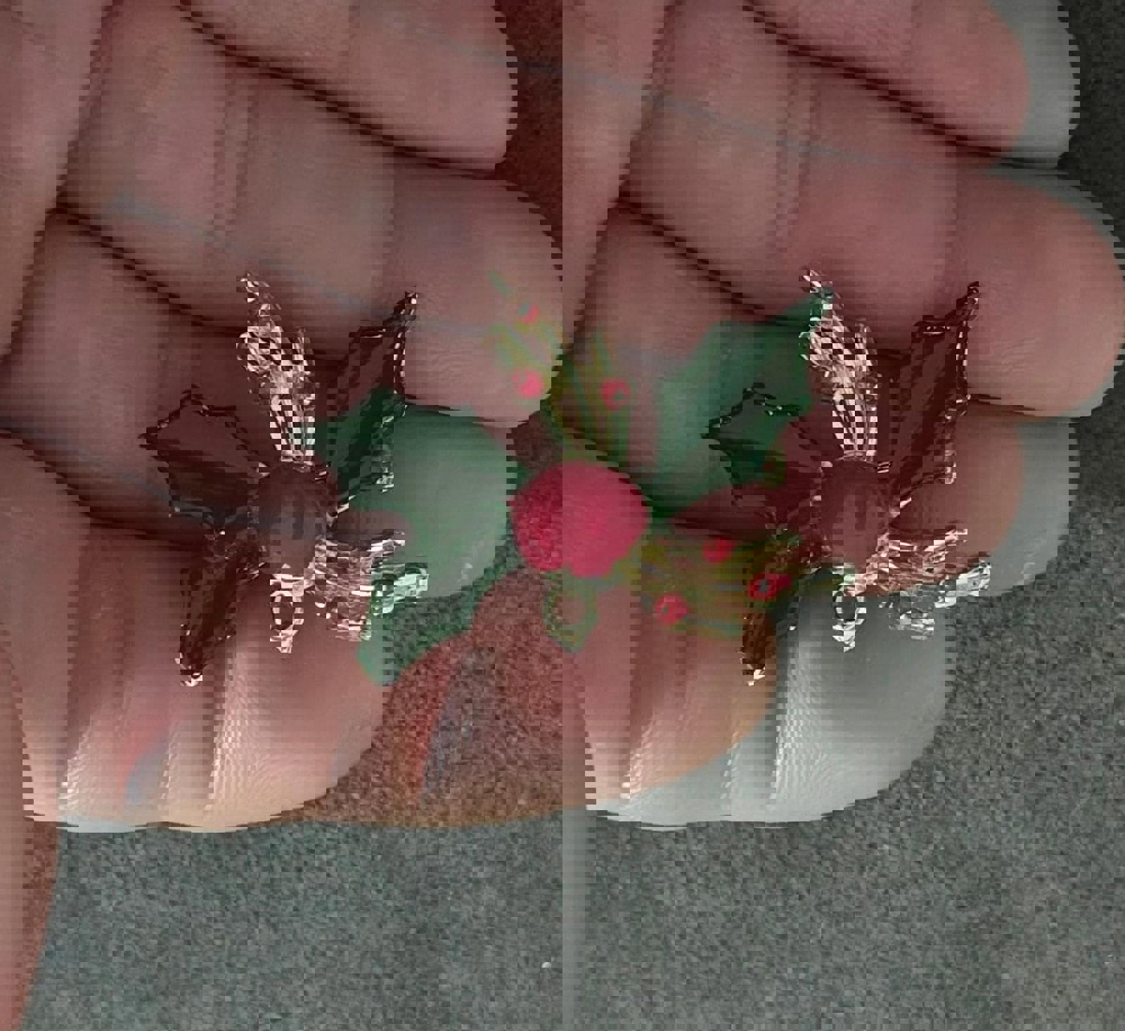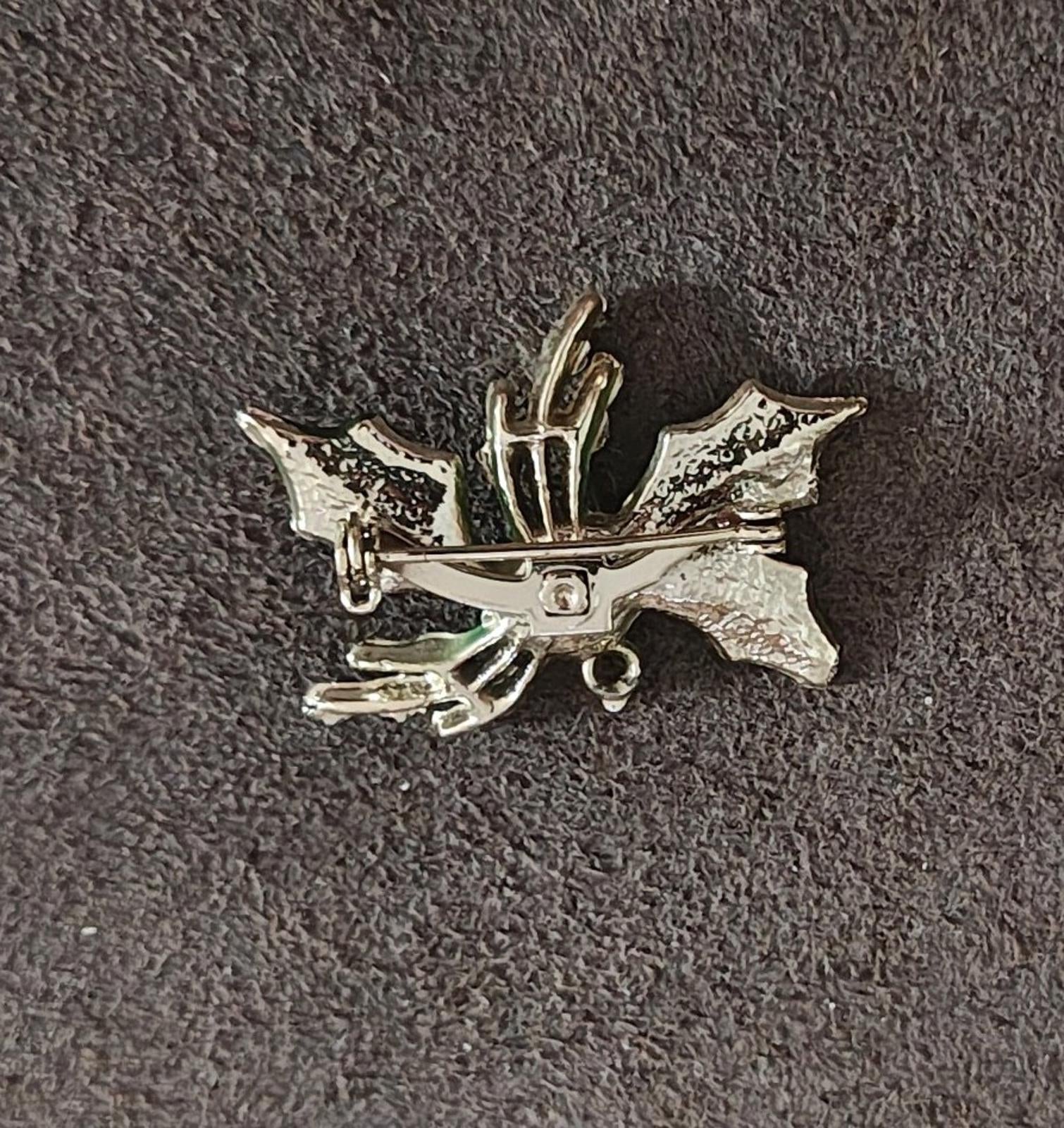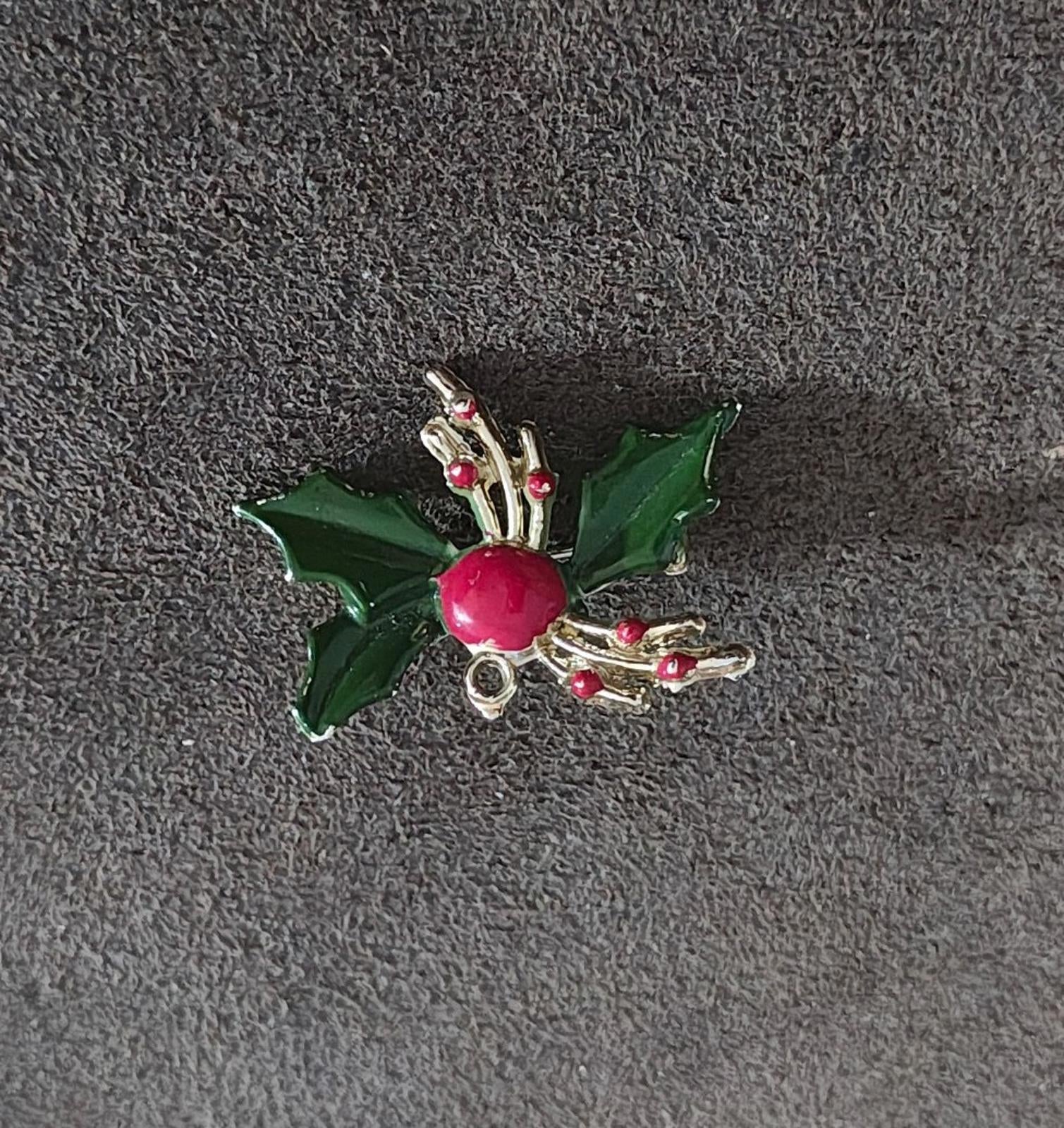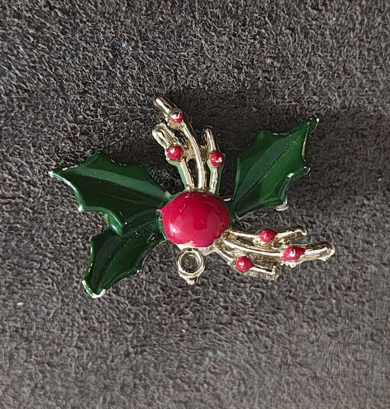 The brooch features a classic holly motif, which is common for holiday-themed jewelry. It has pointed, bright green leaves and one large red berries.