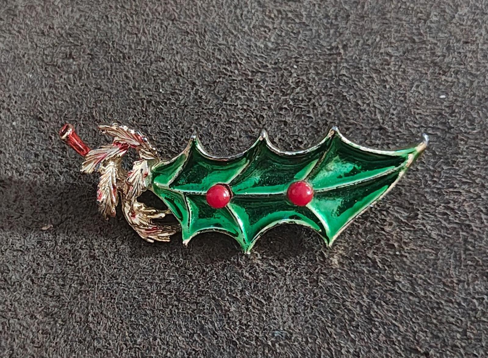 The brooch features a classic holly motif, which is common for holiday-themed jewelry. It has pointed, bright green leaves and two red berries.