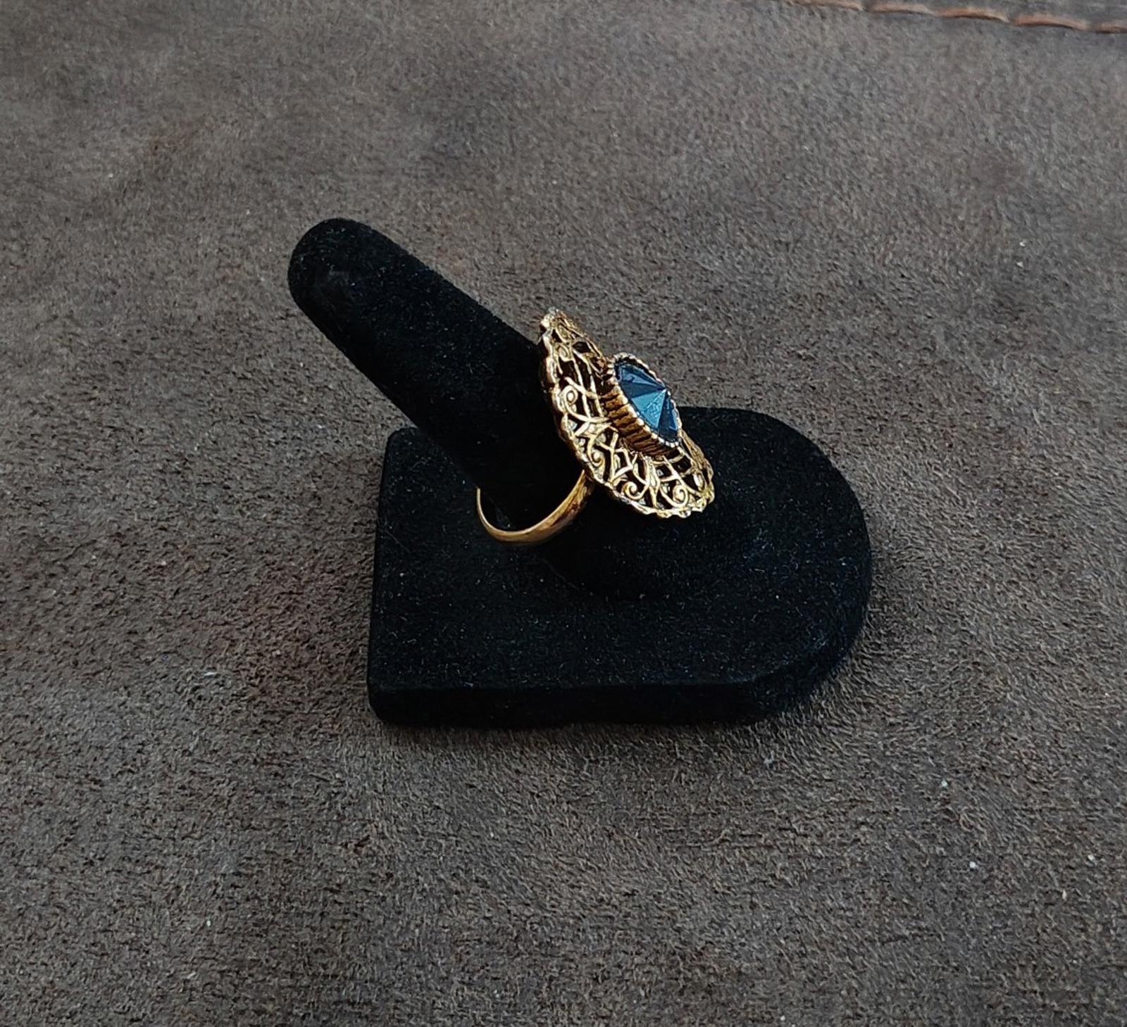 This Elegant Vintage 1980’s Blue Filigree Adjustable Statement Ring is in great condition. It features an oval faceted Bezel Set Blue Glass Stone with Fancy Etched Scrolled Filigree Victorian-style. It is adjustable from size 8.