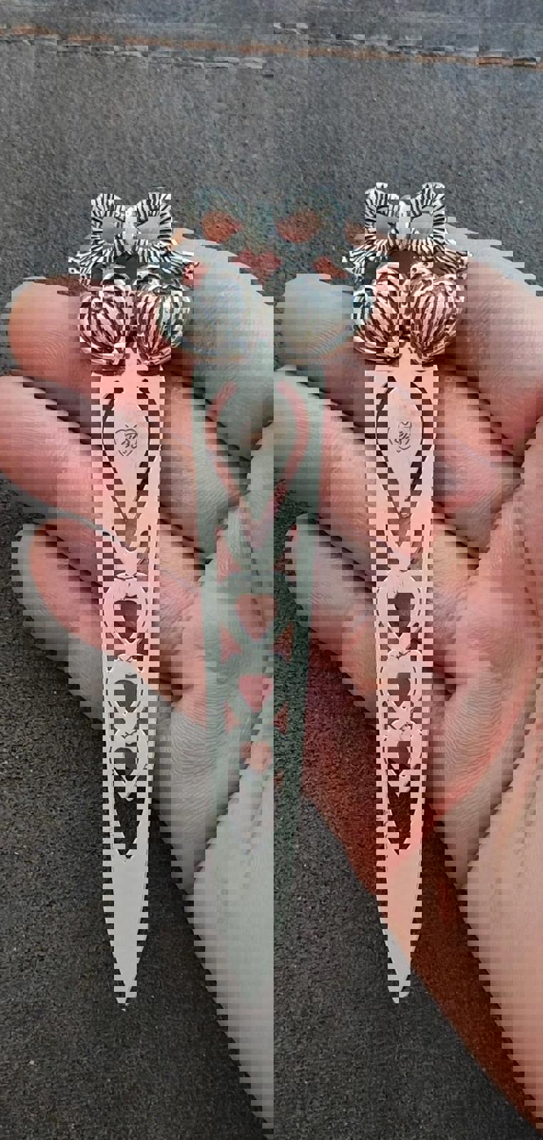 It measures approximately 4 3/4" tall. This great looking bookmark features a ribbon with two hearts on each side of ribbon. Perfect for books and also as a letter opener. Great design and detail on this elegant bookmark.