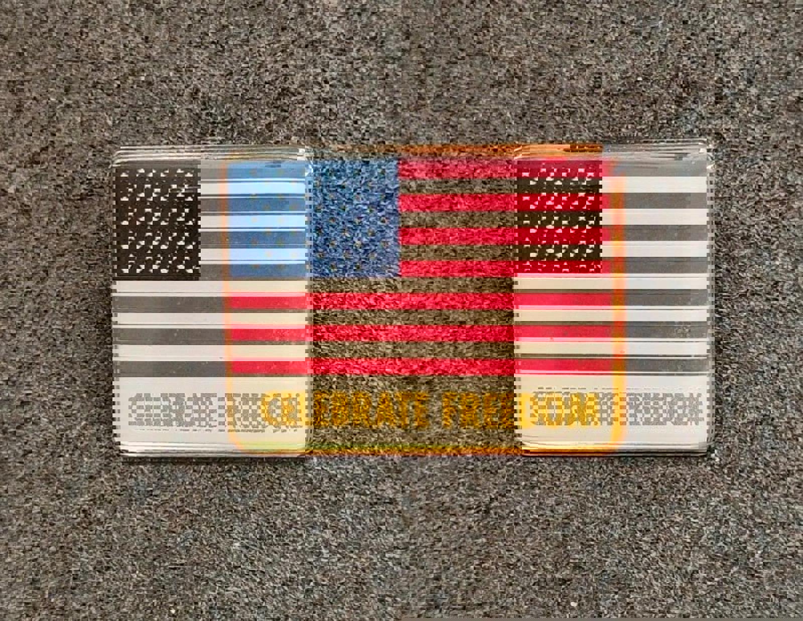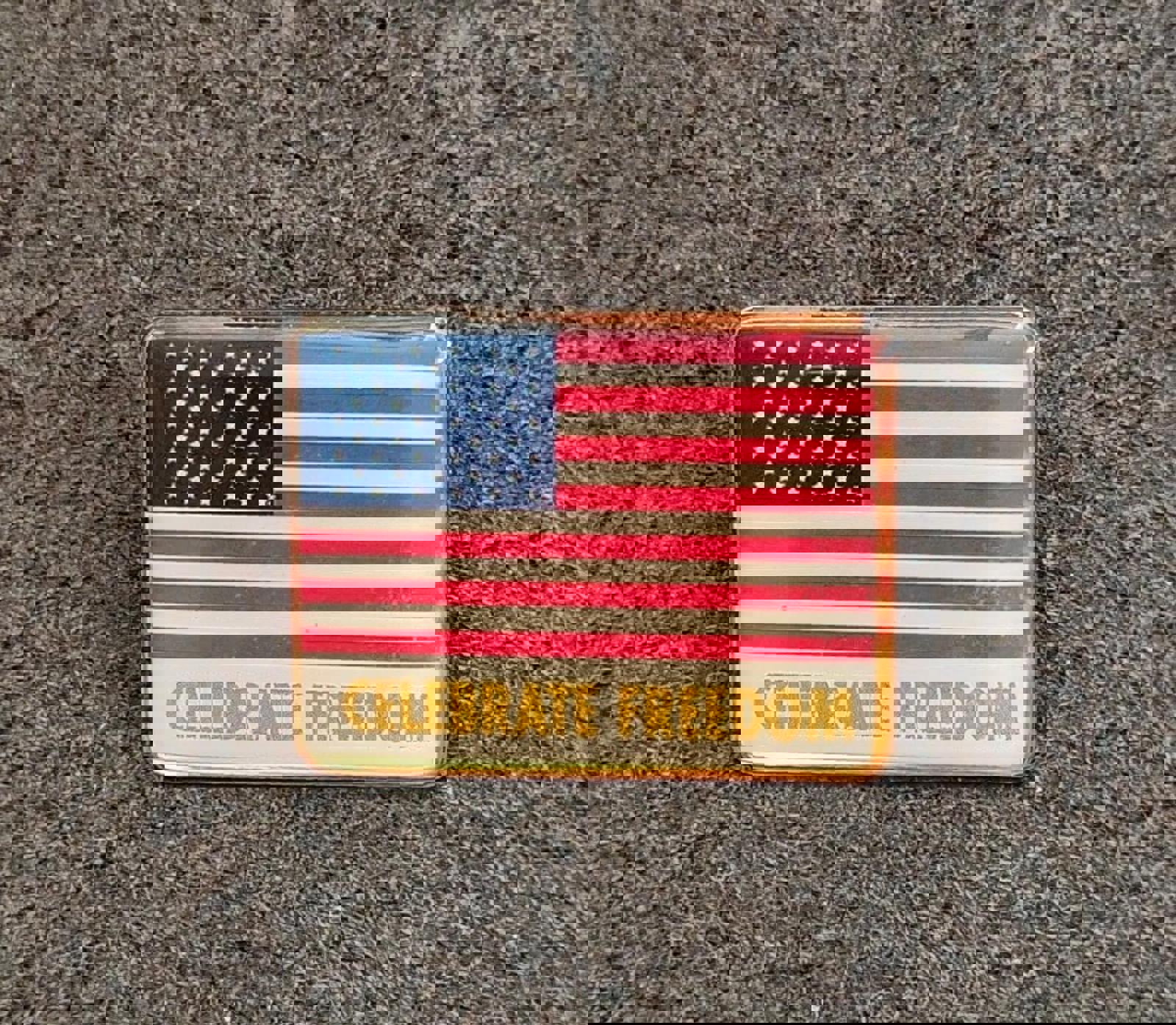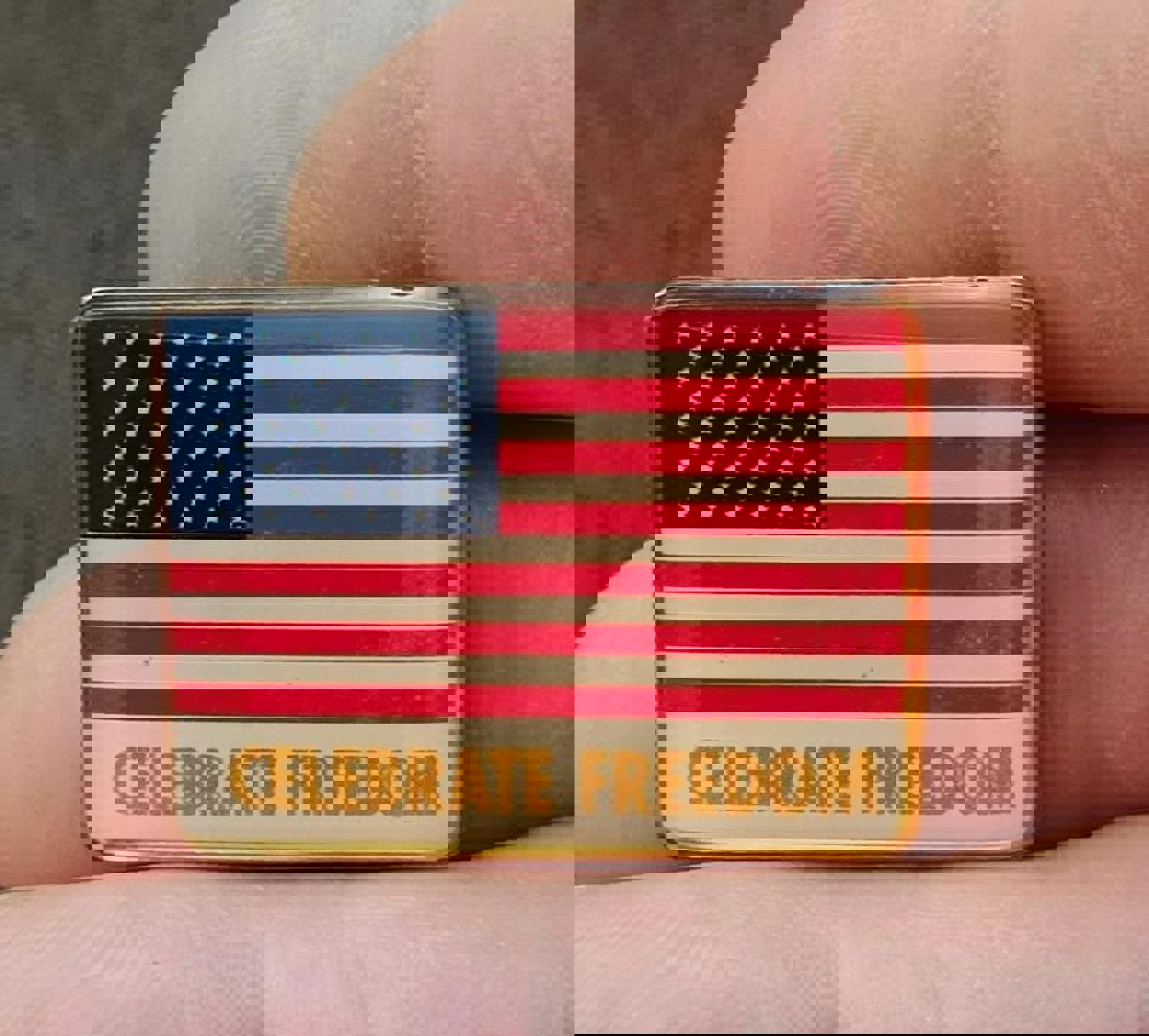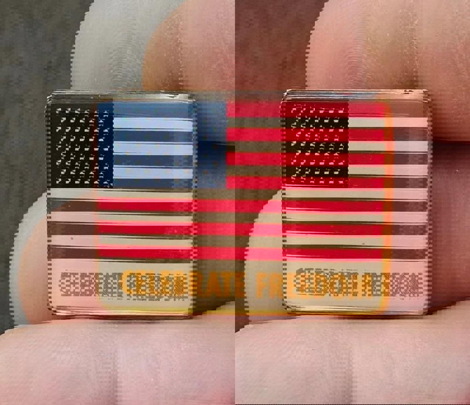This Cool Vintage 1980's Celebrate Freedom American Flag Patriotic Gold Tone Pin is in Great Condition.