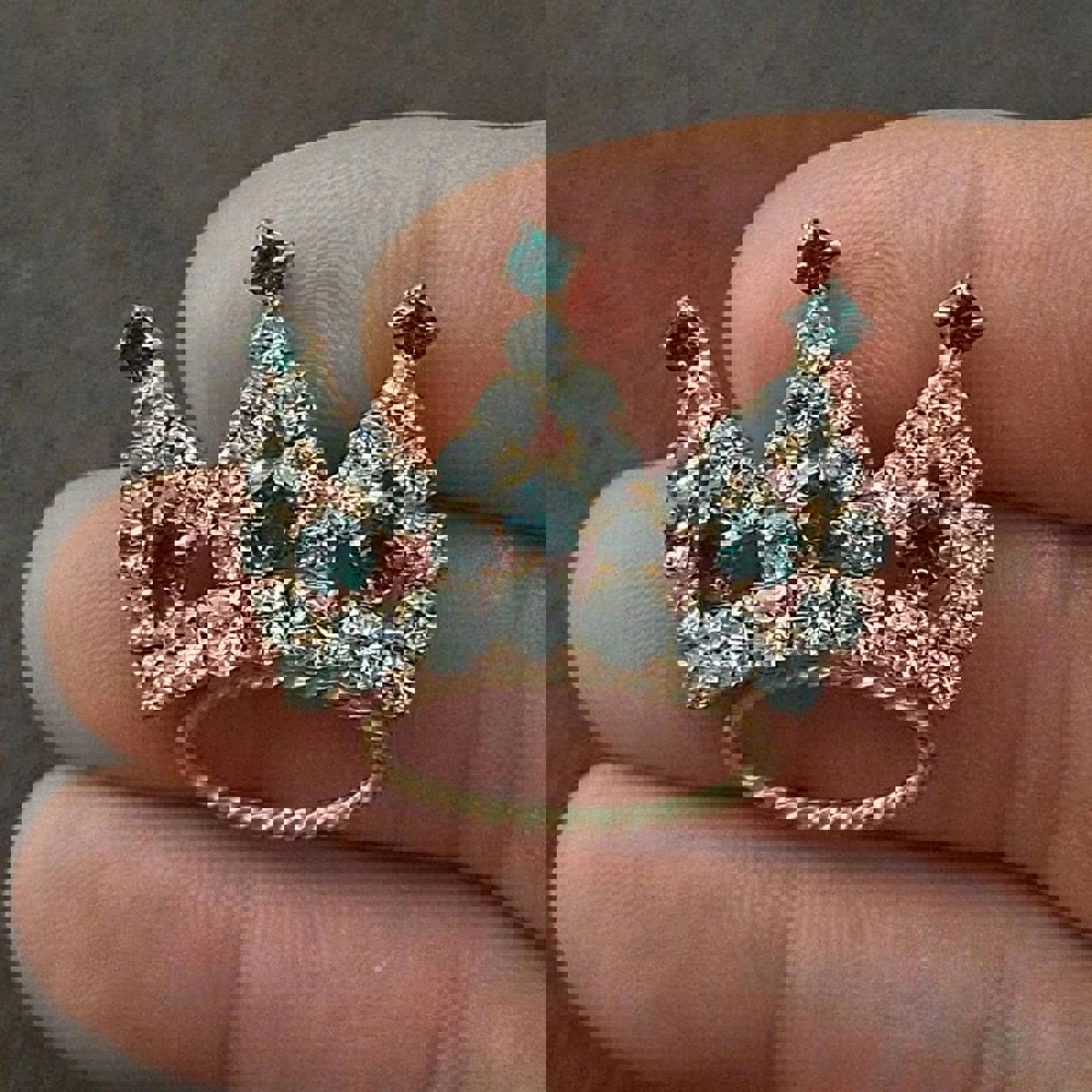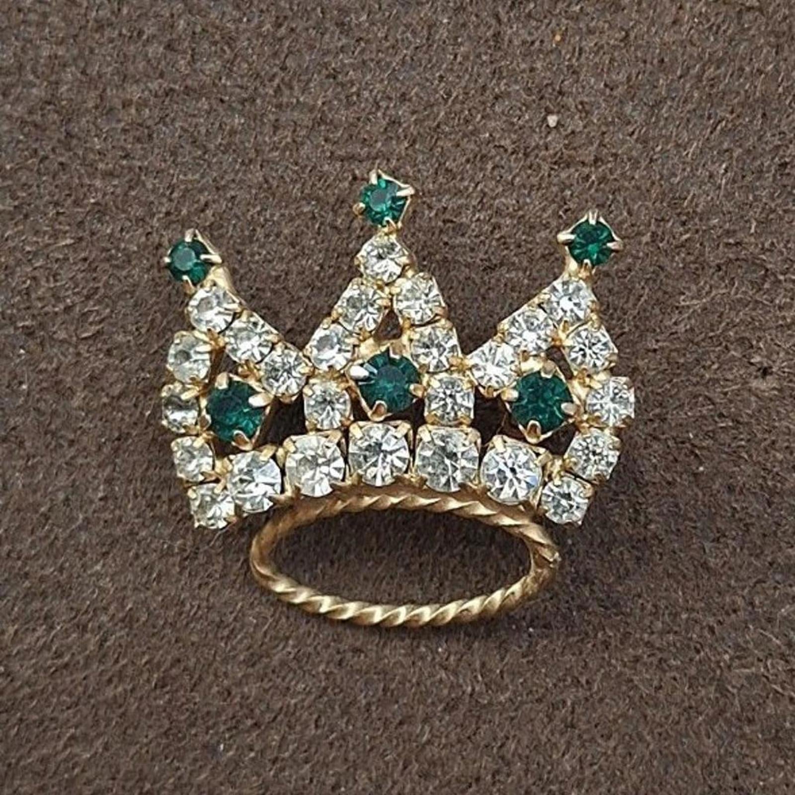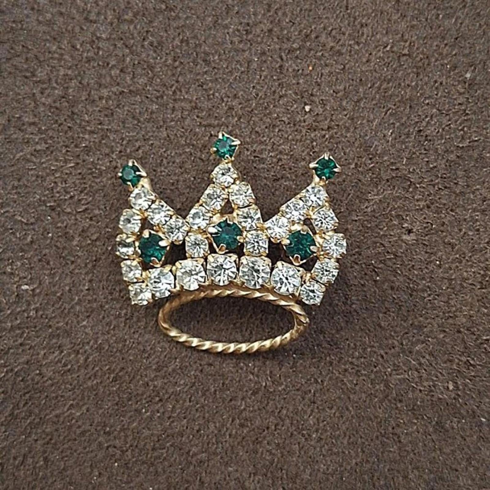 Very sweet, fully pronged, rhinestone crown pin/brooch with green and clear rhinestones. It measures approximately 1 by 1 inch.