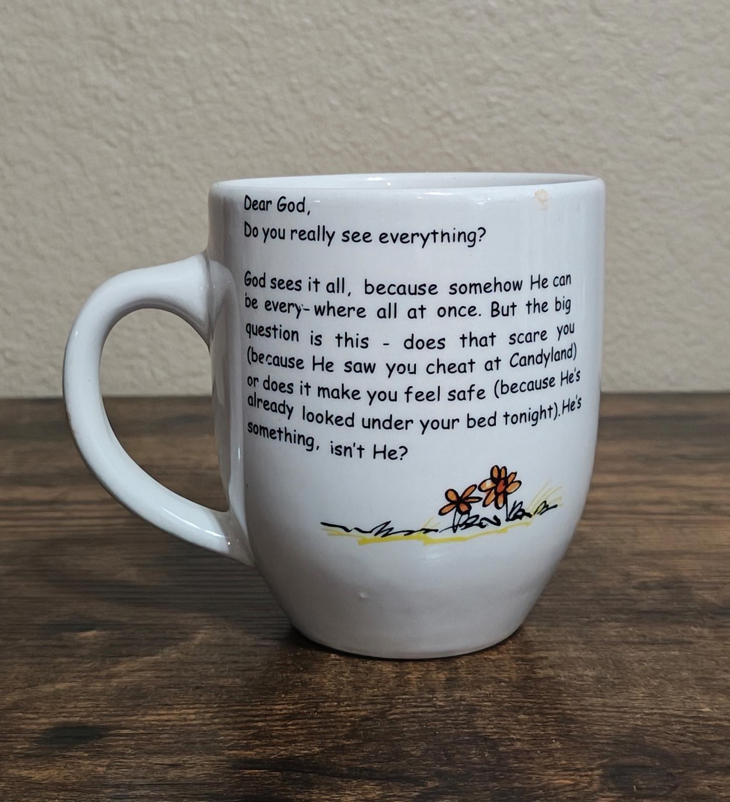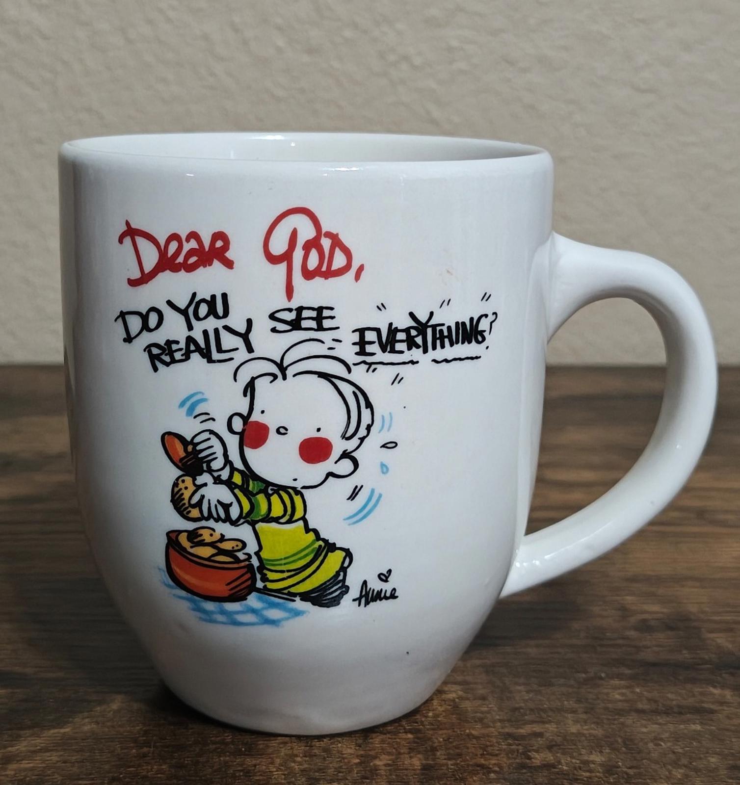 It measures approximately 4.25' tall and holds 16 fluid ounces. This Royal Norfolk mug cup is a vintage piece featuring a religious theme with a cartoonish touch. The small ceramic mug in multicolor and depicts an image of faith with a humorous twist, perfect for all occasions. It is dishwasher/microwave safe.