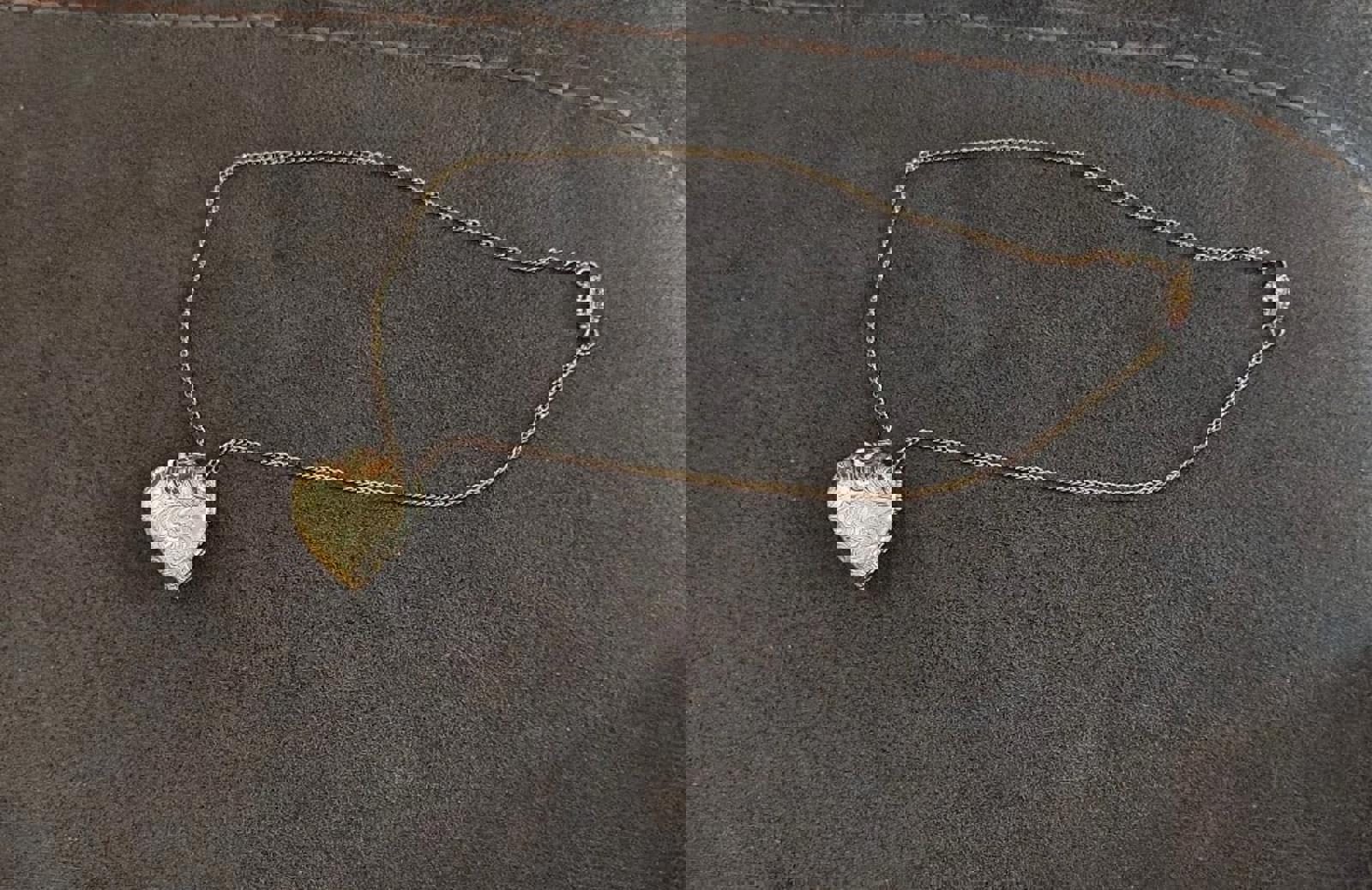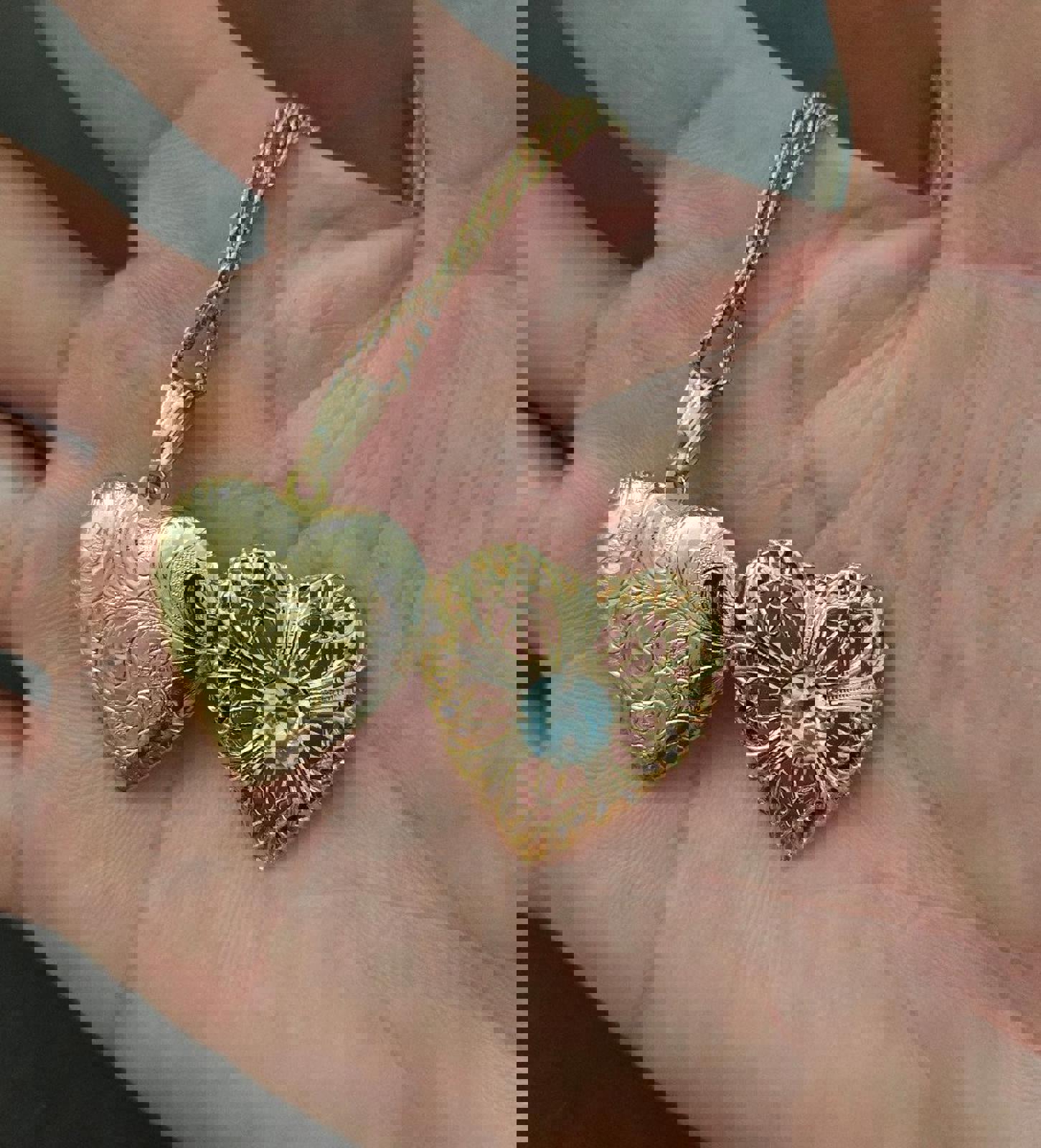 The heart pendant measures approximately 1 1/2" tall with bail. The chain measures approximately 16" long and fits a photo about the size of 3/4" x 3/4".