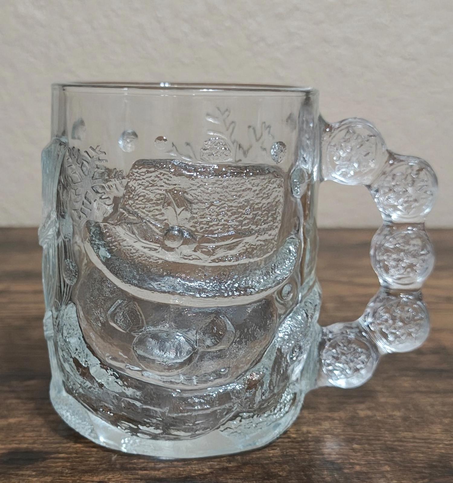 1980's Luminarc Snowman With Snowflakes 3D Embossed Clear Glass Mug