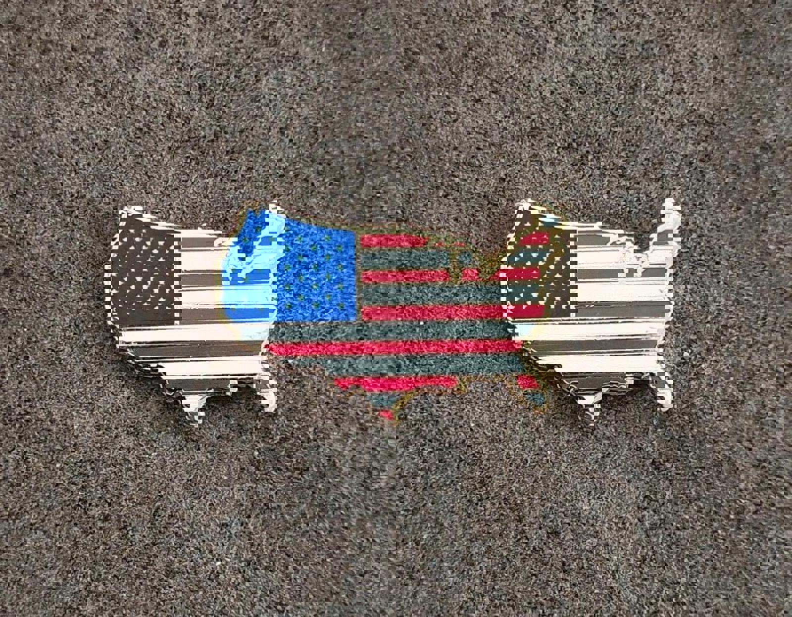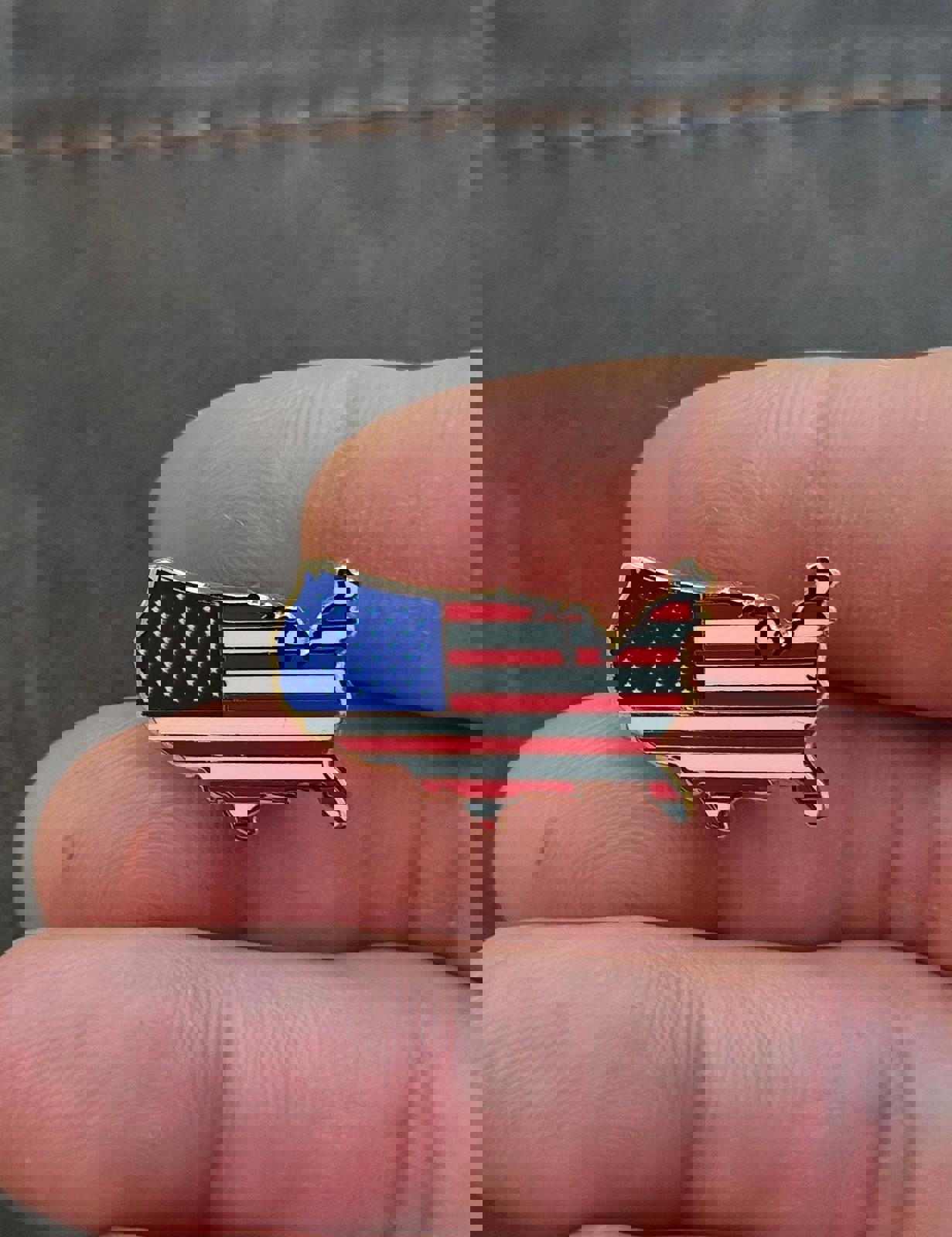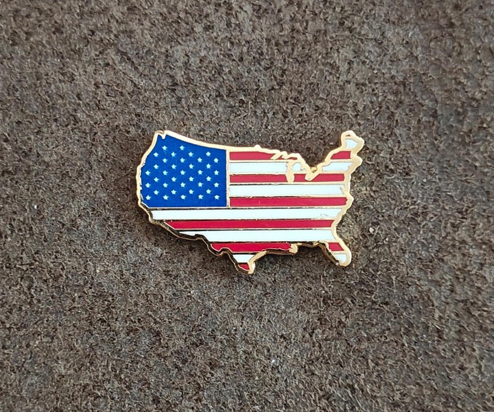 It measures approximately 1" long. This vintage pin is shaped like the geographical outline of the contiguous United States, featuring the iconic red, white, and blue design of the American flag within its borders. The pin serves as a patriotic accessory, allowing individuals to display their American pride on clothing items like jackets, hats, ties, or backpacks. It symbolizes national pride, unity, and can be worn to commemorate patriotic holidays, honor veterans, or simply express love for the country.