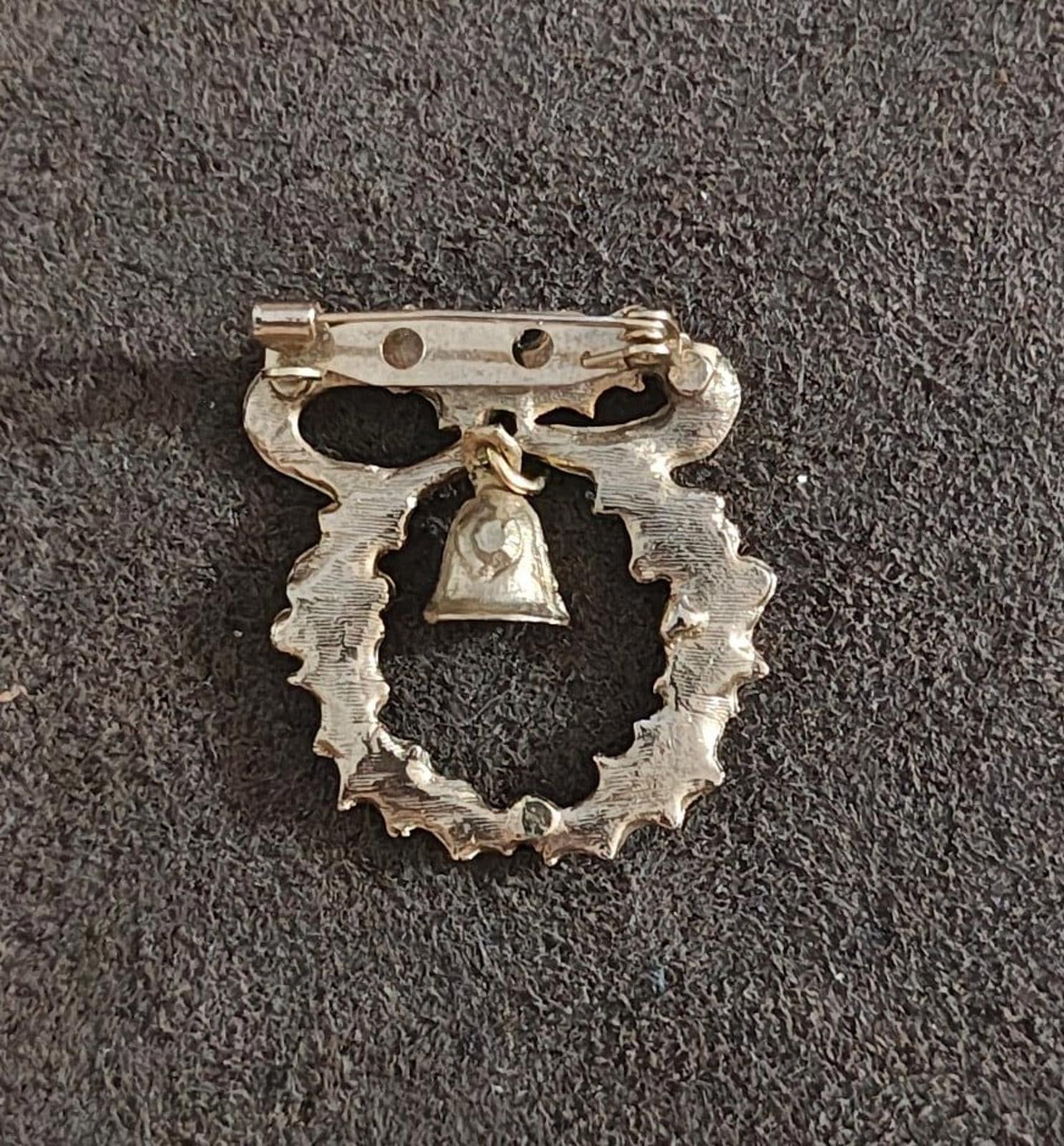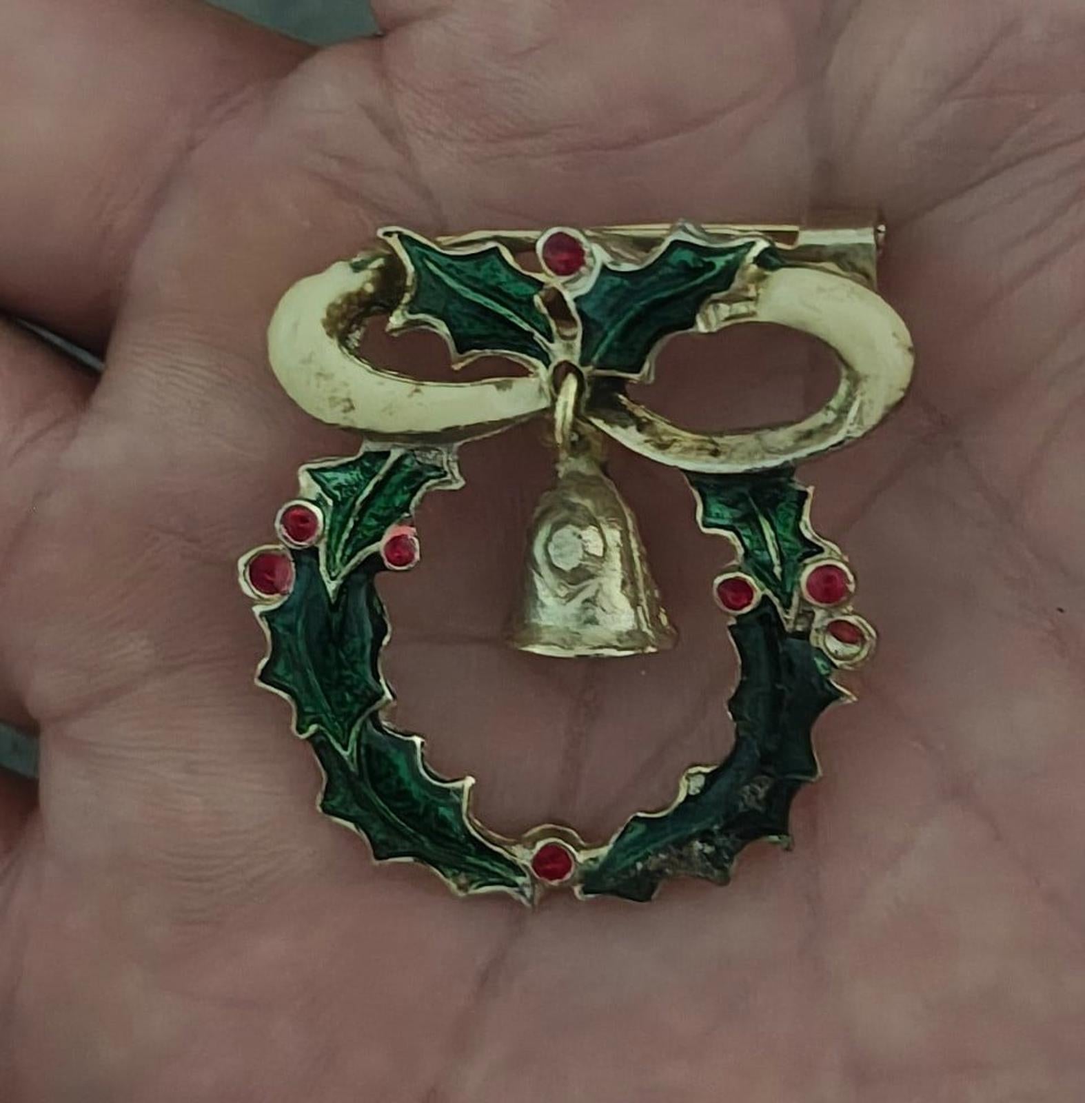 The brooch is gold-toned and enameled in green, depicting a holly wreath. It features red accents that resemble berries or rhinestones, and a small, dangling bell is suspended in the center.