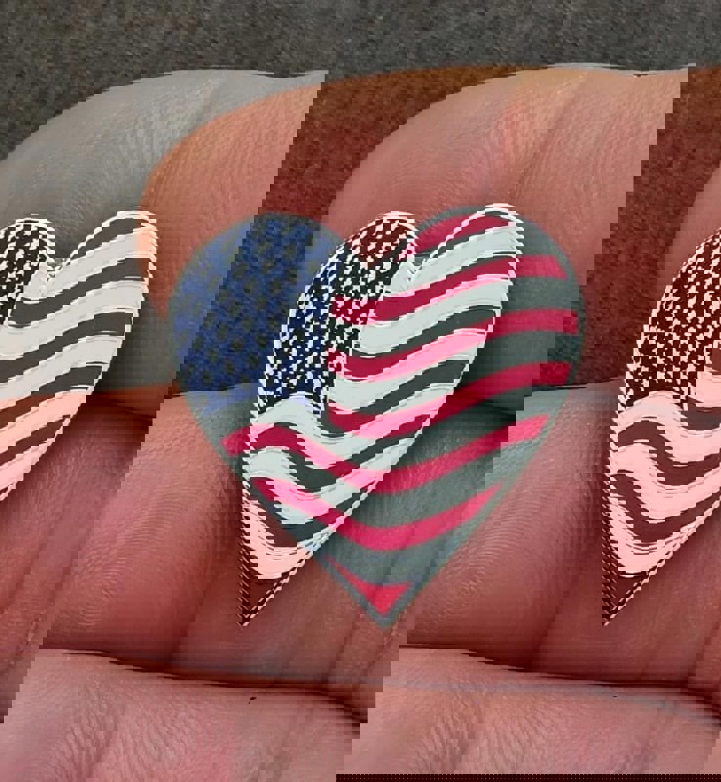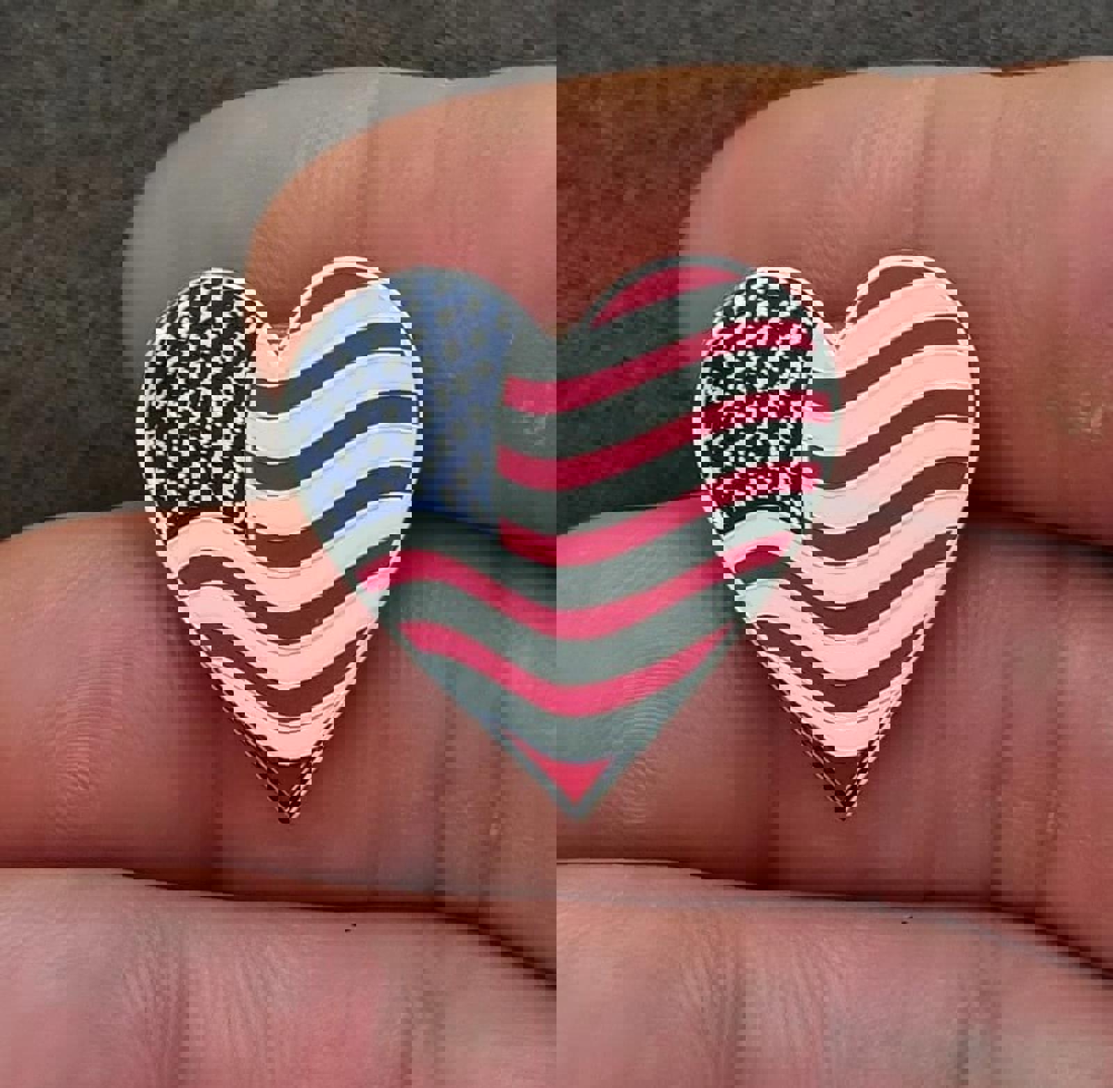 It measures approximately 1" x 1". This vintage pin is a symbol of patriotism and national pride, combining the imagery of the American flag with the universal symbol of a heart to express love for the United States. High quality cloissone pin.