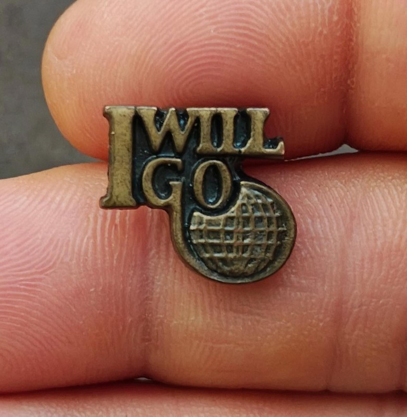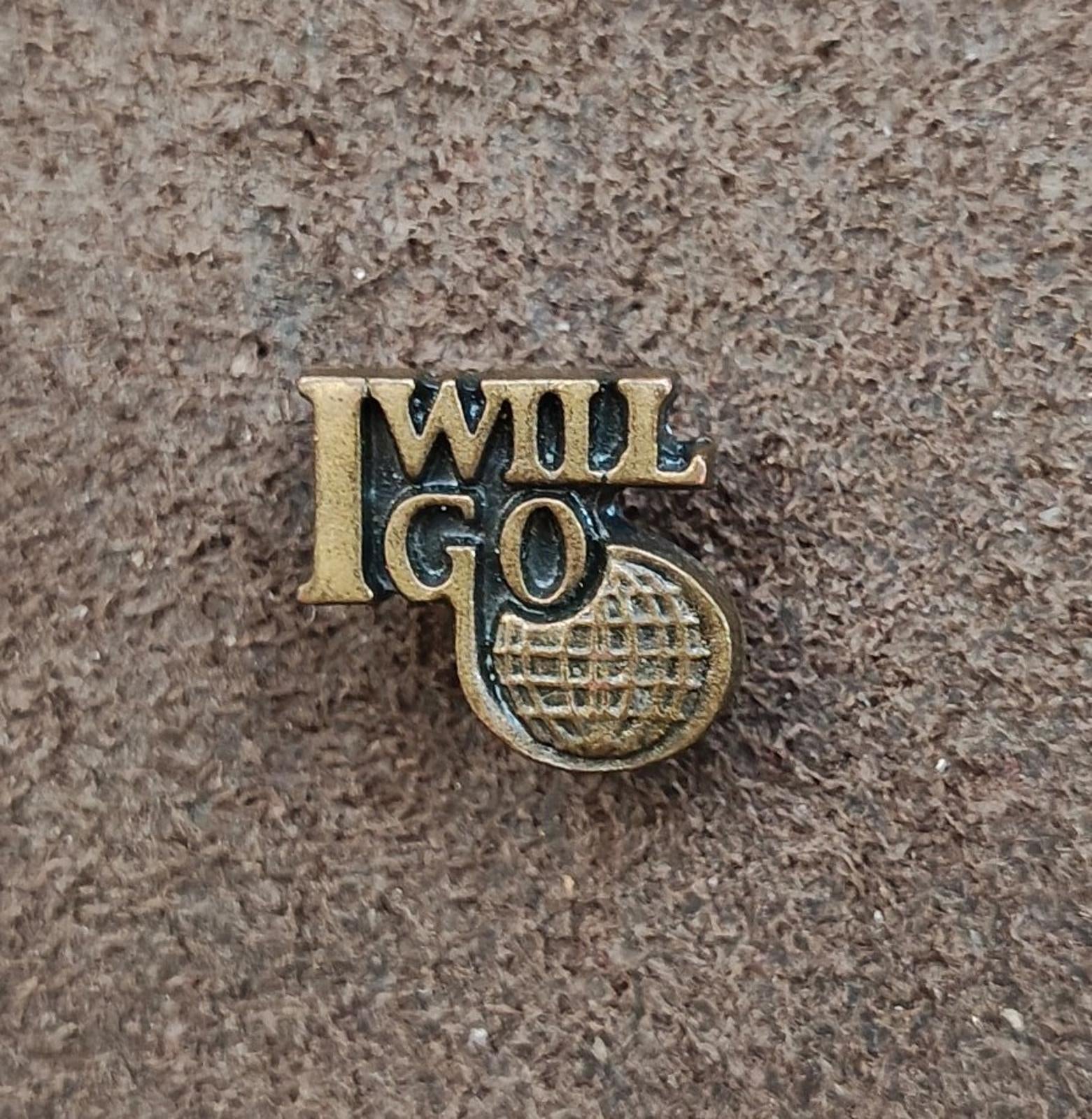 It measures approximately 5/8" X 5/8". This "I Will Go" vintage pin is often associated with global ministry, outreach, or missionary work. The design features the text "I WILL GO" next to a small globe emblem. The pin is commonly used by religious groups, such as the Global Pathfinders, or as a general item for those involved in worldwide mission and outreach efforts