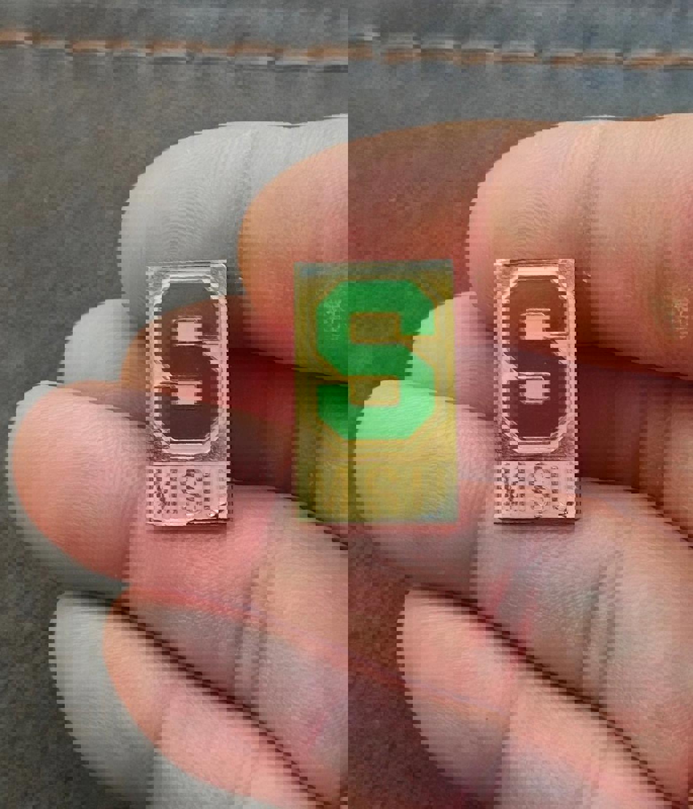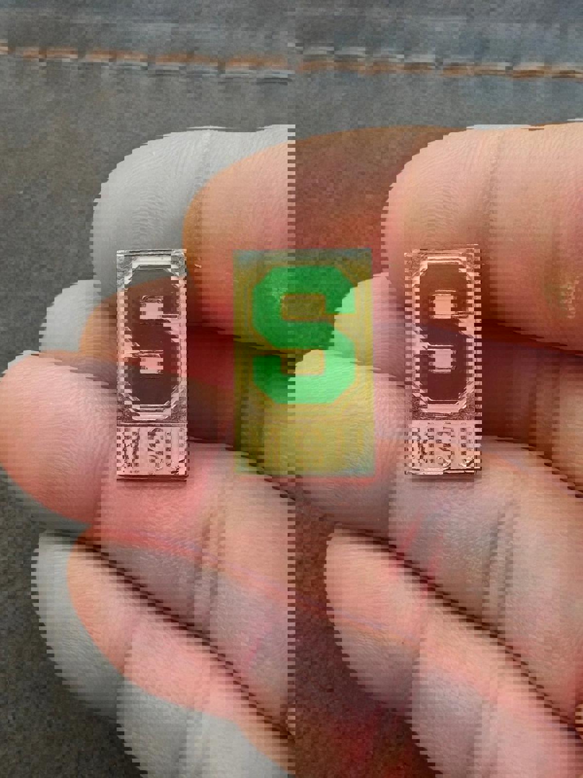 The pin features a prominent green block letter "S" with white trim, positioned above the letters "MSU" in gold or white text, all within a rectangular gold-toned frame. This logo is a recognized mark of the university's athletic and academic history.