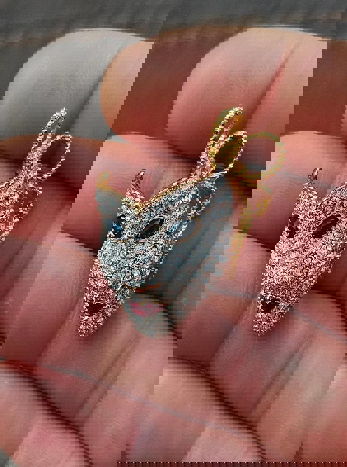 Swarovski pieces are always a terrific quality construction. It is set with pave clear sparkling crystals. Blue eyes and lipstick red lips. A golden bow adds more accents. It features shining silver and gold plated finishes. Rhodium plating over the metals gives the piece a brilliant, durable finish. Beautiful sparkler!