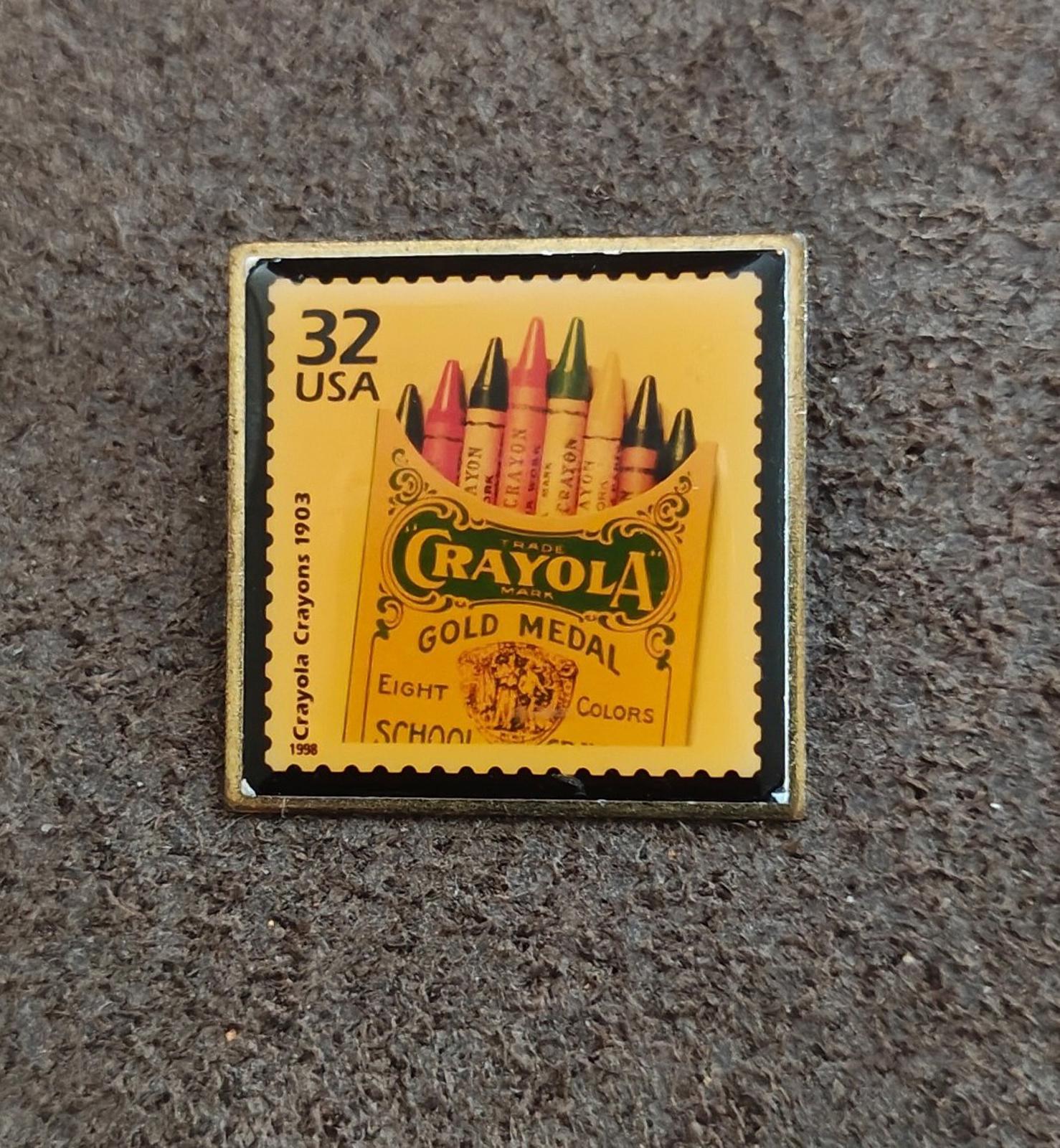 This vintage pin that replicates a 32-cent postage stamp issued by the United States Postal Service (USPS) in 1998. The pin features the design of a stamp honoring the 1903 first box of Crayola crayons. It measures approximately 1" x 1" and Made in the USA.