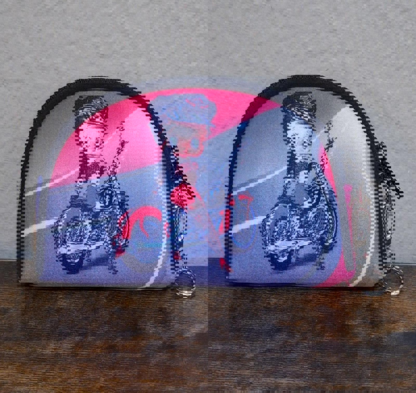 This Adorable Vintage 2002 Betty Boop Riding Her Motorcycle Wallet Coin Purse Cosmetic Bag is in good condition. It features Betty Boop on a motorcycle with shades of pink, purple and blue and also has an attached Keychain.