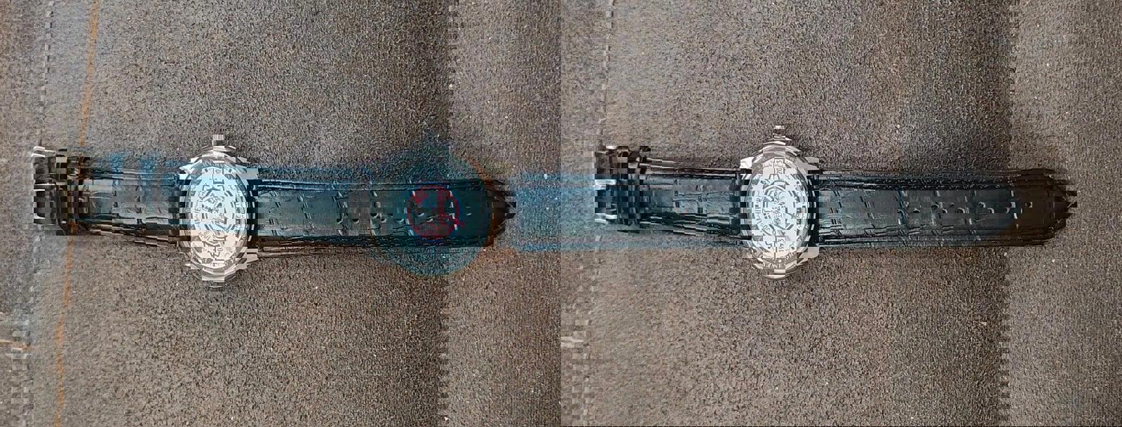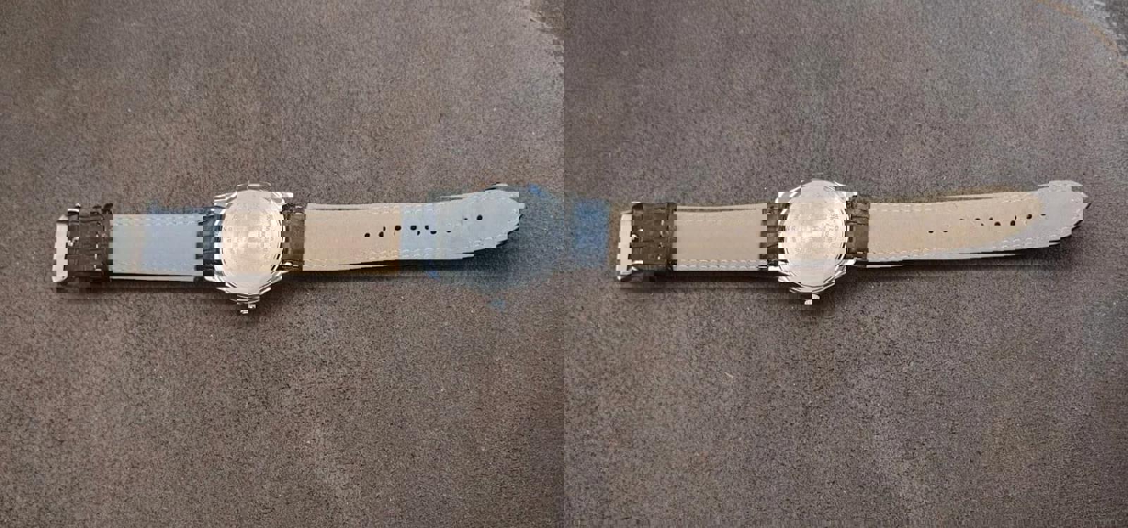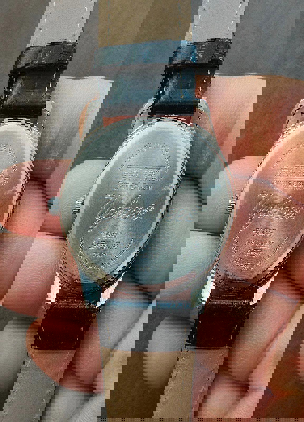 This watch has a stainless steel case back, three hand quartz Japanese movement, mineral crystal face, and a black leather strap. Adjustable band fits up to an 8" size wrist. Case size 36mm.