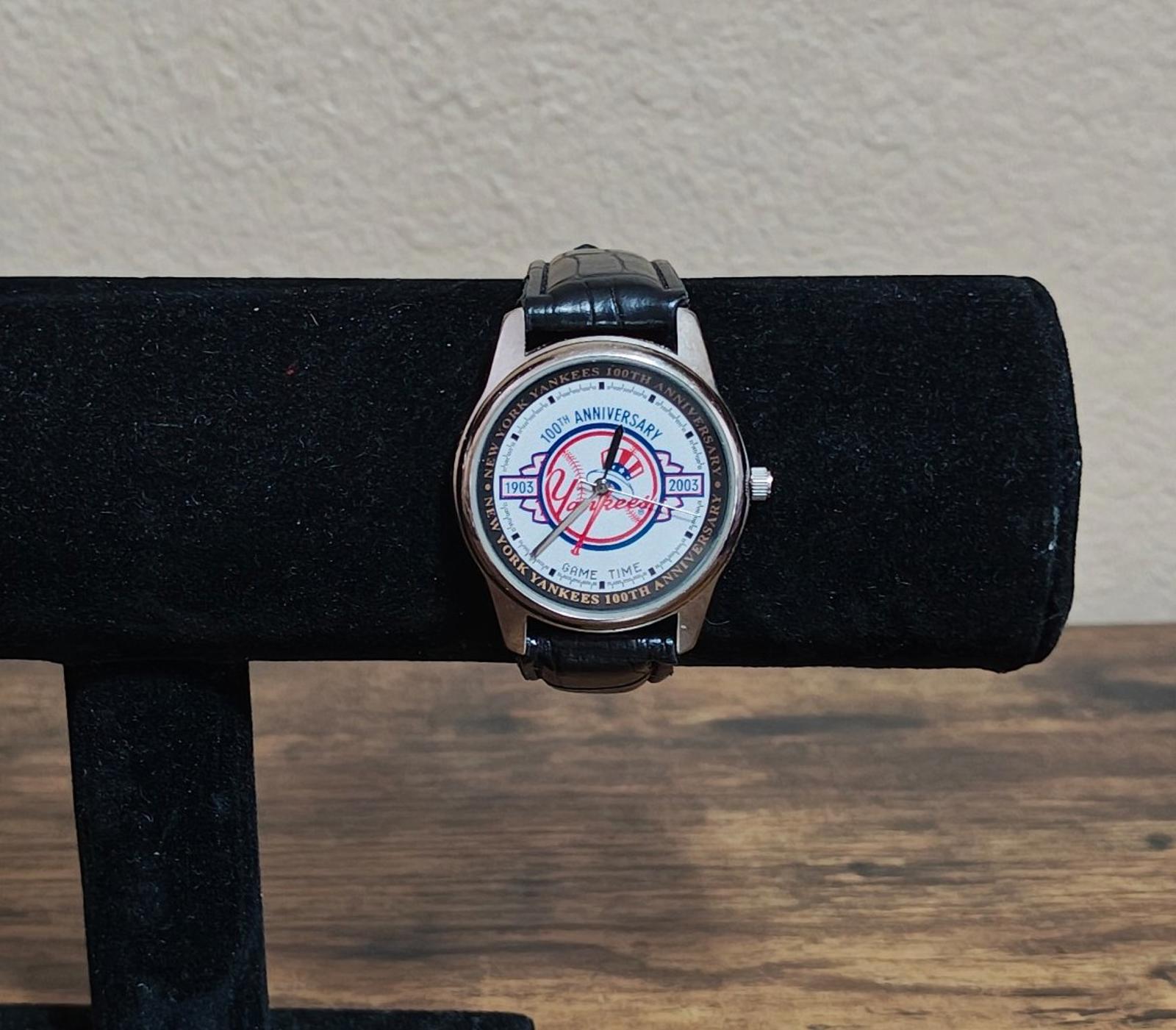 This watch commemorates The New York Yankees 100th Anniversary, 1903-2003. It was manufactured by Game Time and released by Avon in 2003 as a limited collectors' item to celebrate the team's centennial.