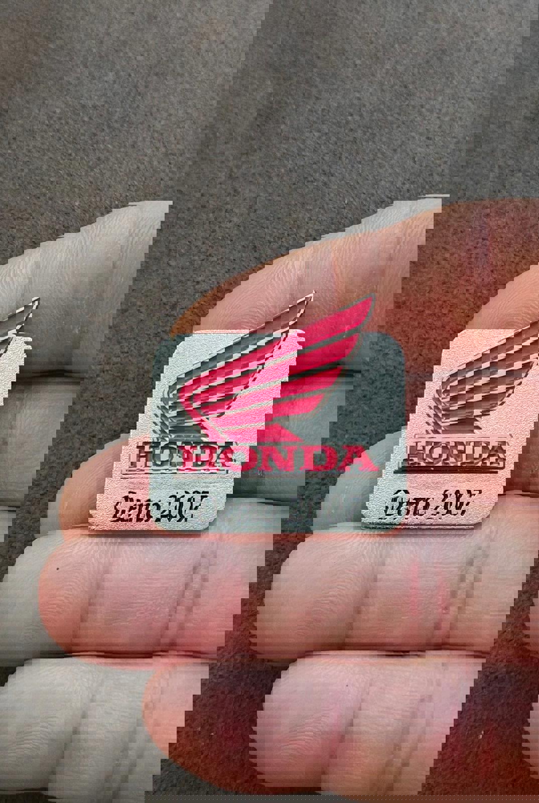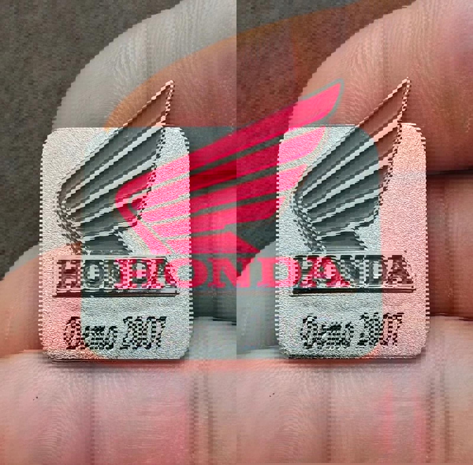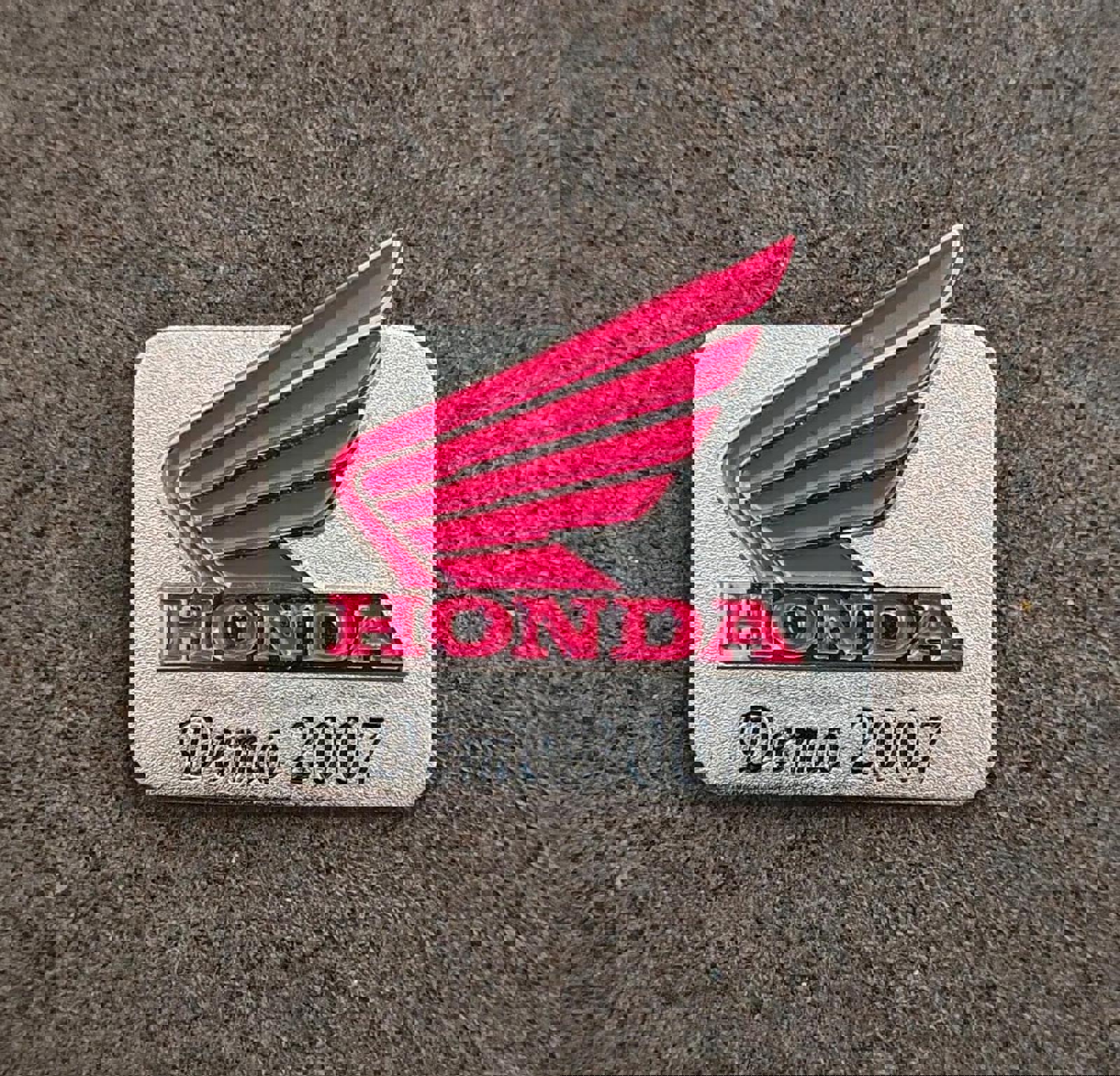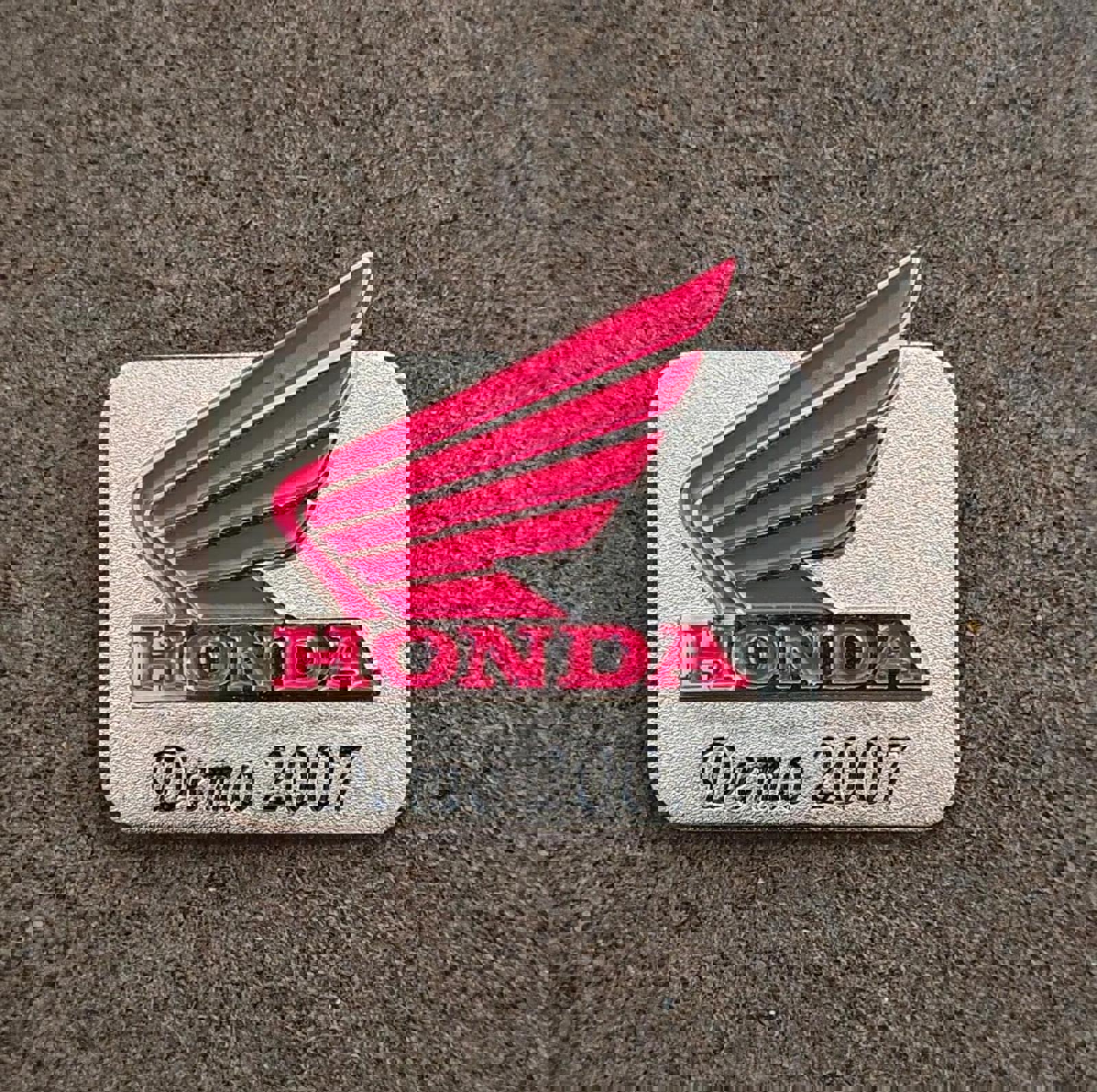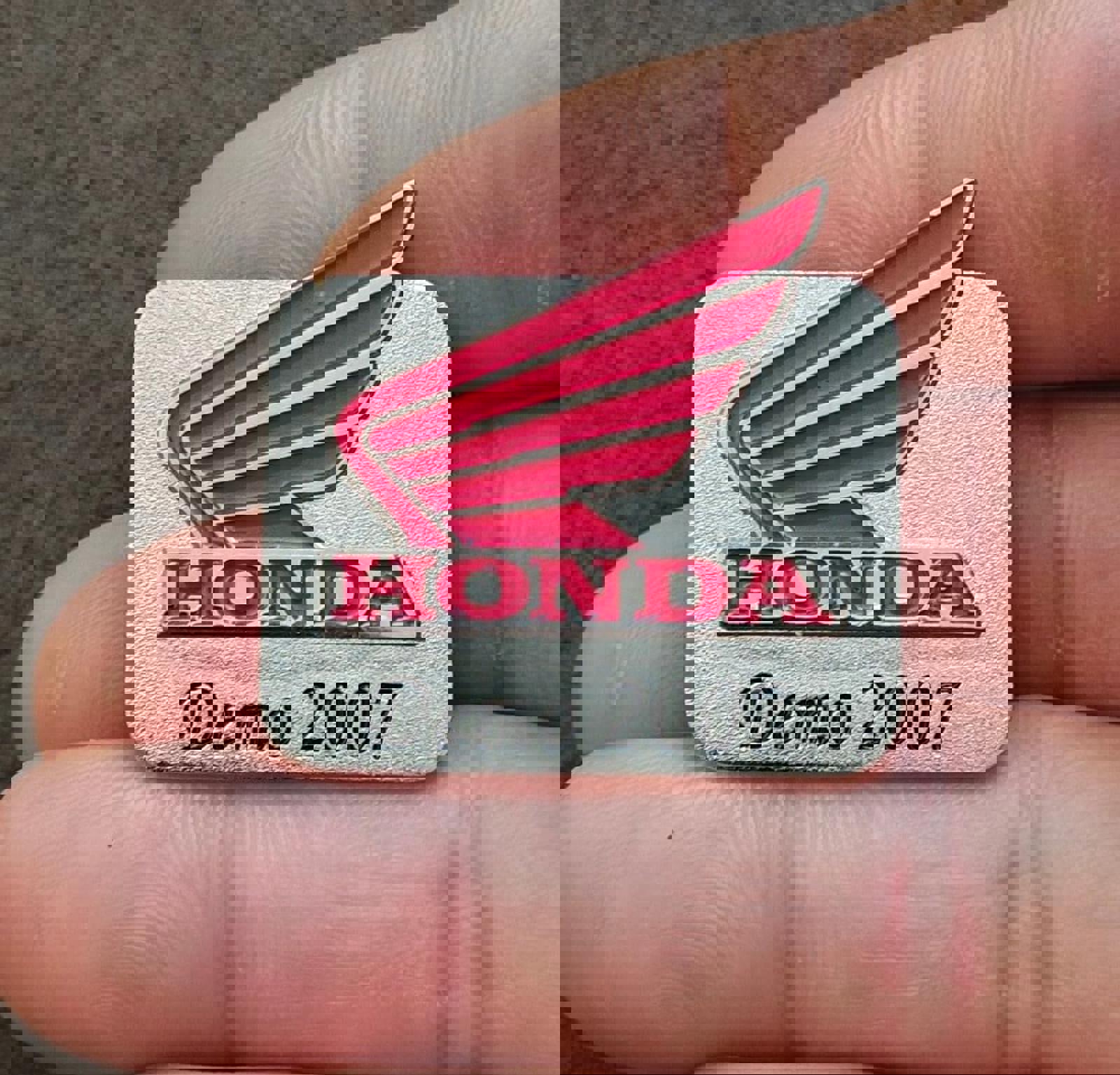 It measures approximately 1 1/4" x 1 1/2". This vintage pin features the Honda wing logo and says "HONDA 2007 Demo" on it.