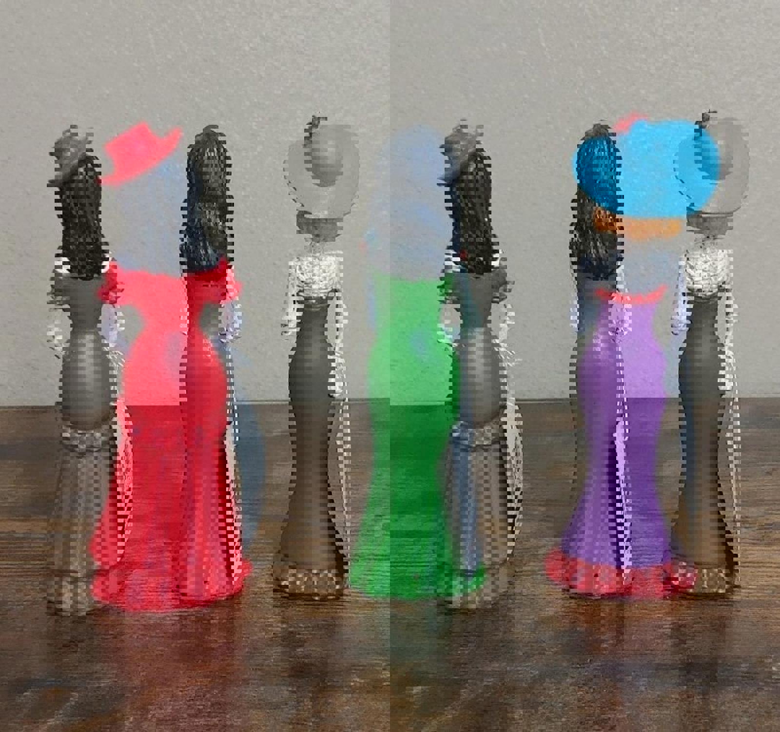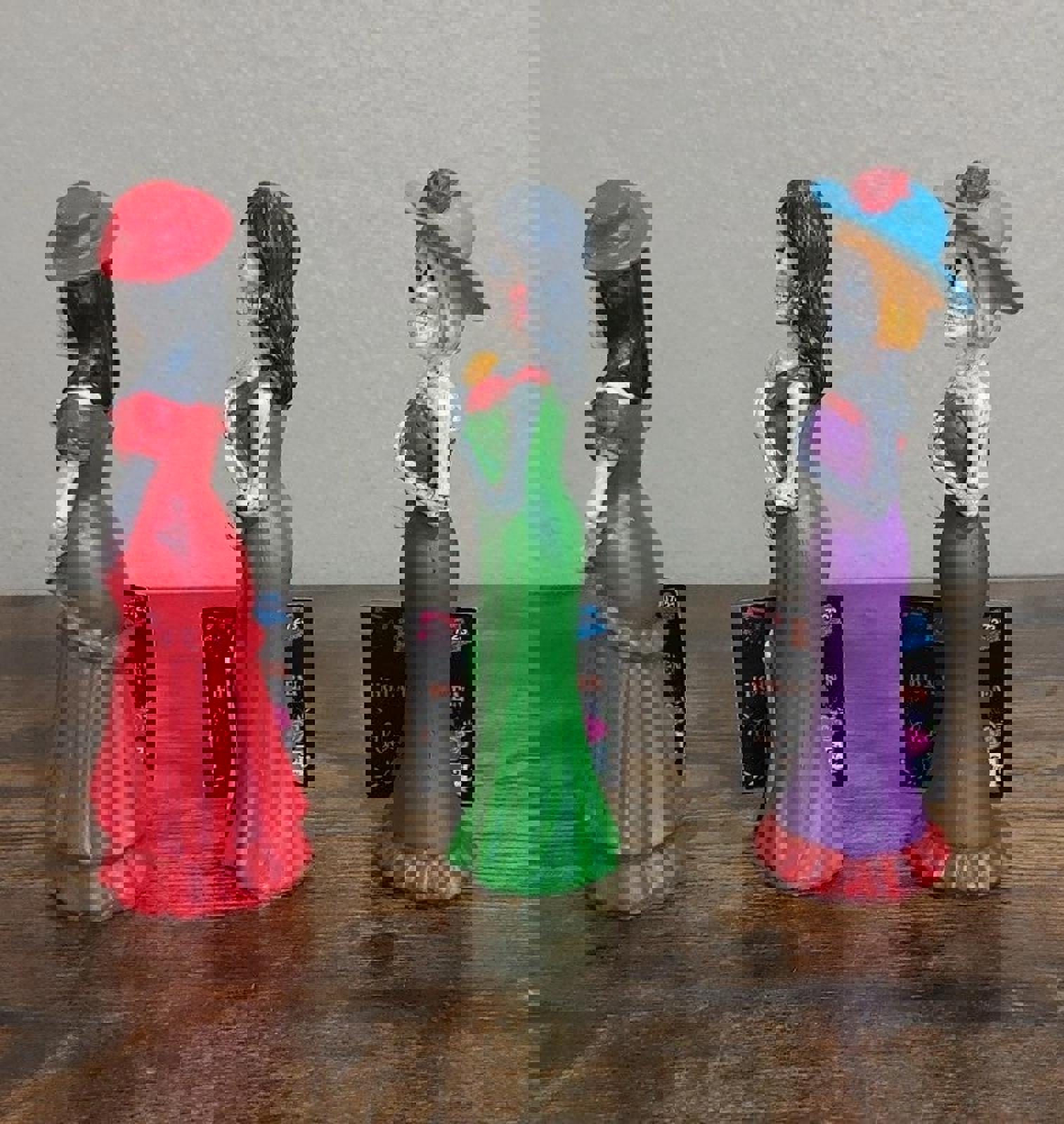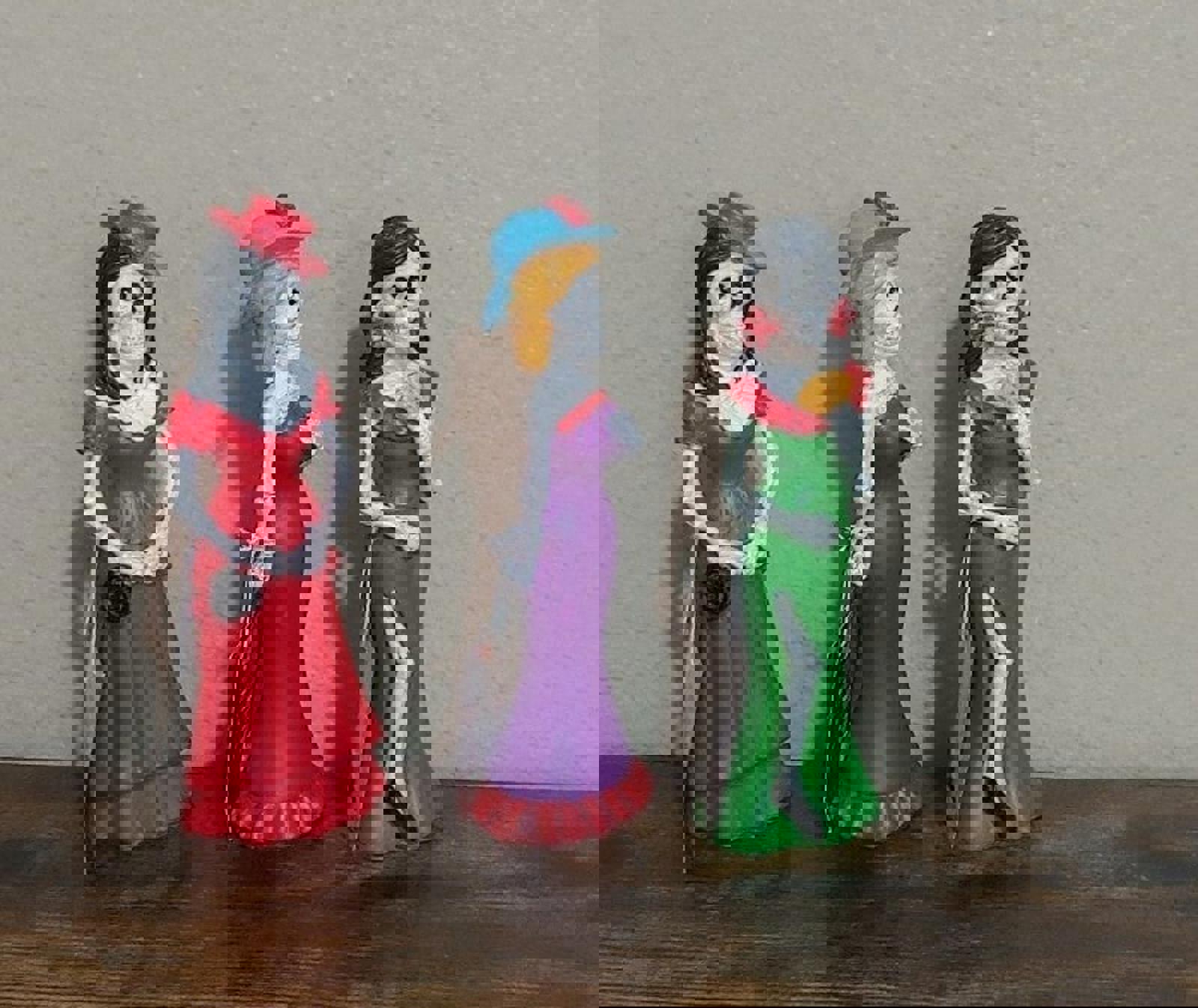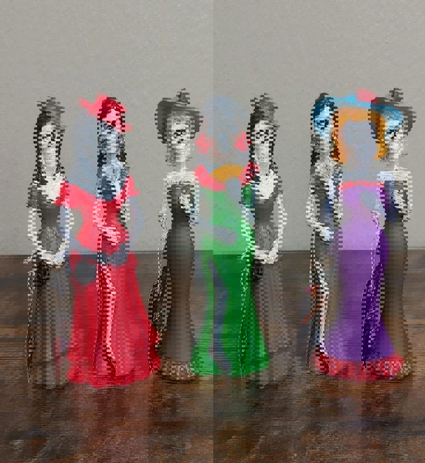 This Cool Set Of 3 Dia De Los Muertos Day Of The Dead Sugar Skull Festive Catrina Figurines are in excellent condition. They measure approximately 6" Tall. Very Colorful And Detailed & Festive set. Super fun and perfect addition for your Halloween decorations other occasion and for display.