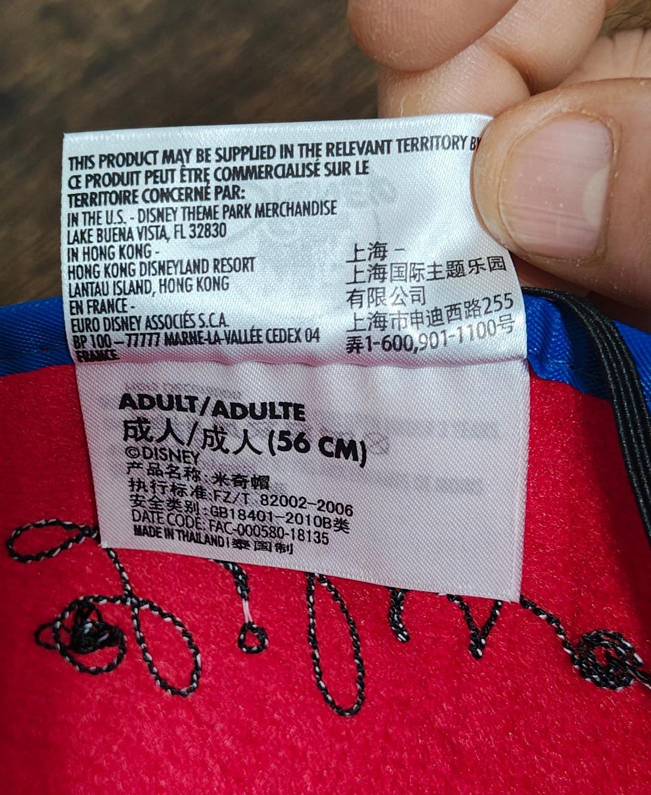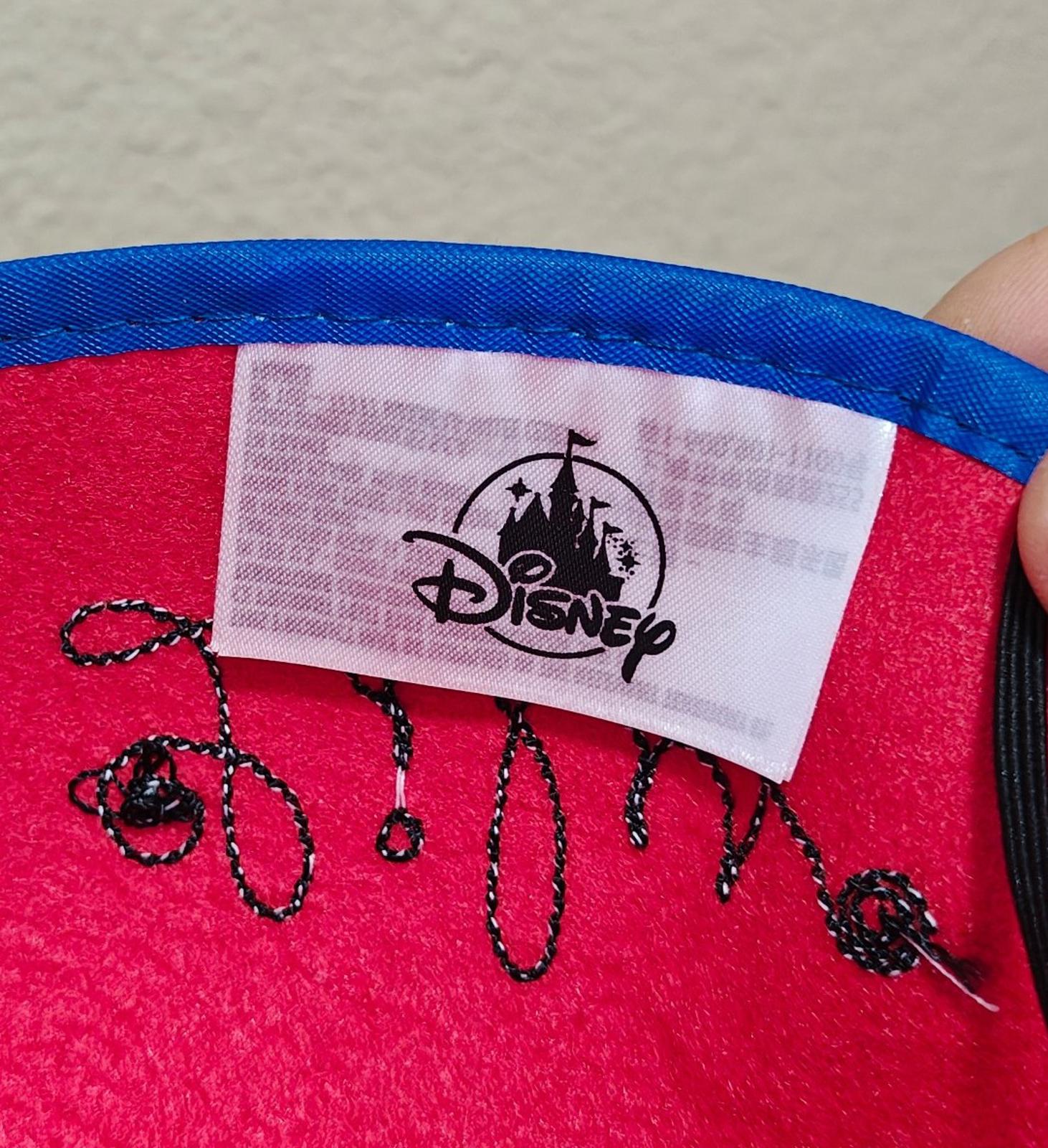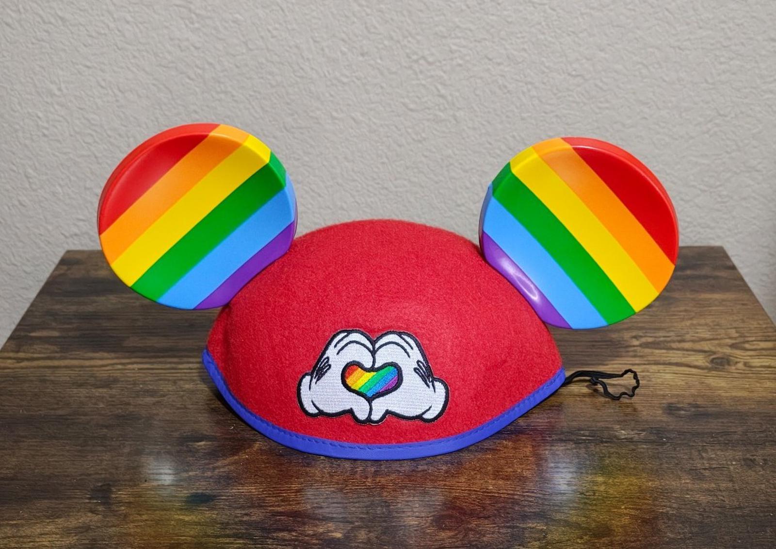 This Mickey Mouse Rainbow Love ear hat was released by Disney in celebration of Pride Month. The hat features a red felt cap with rainbow-striped ears and a blue trim. The front of the cap has an embroidered embellishment of two Mickey gloves clasped together, forming a heart.