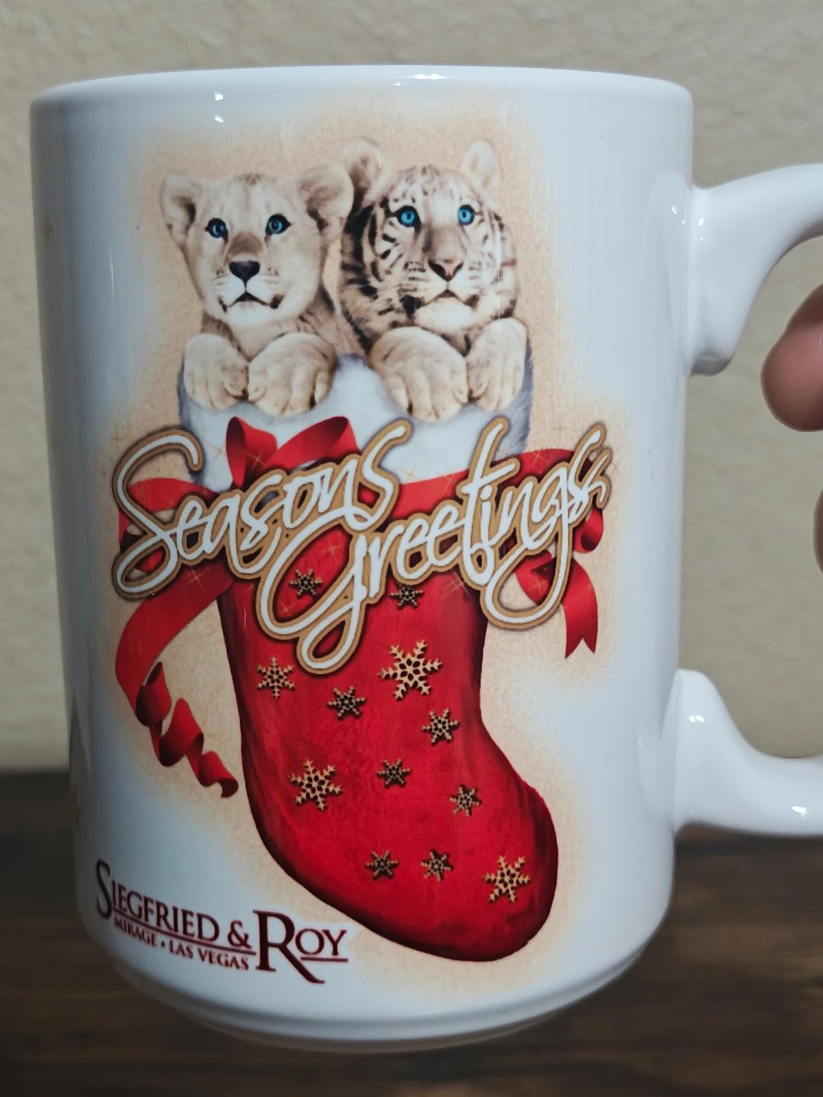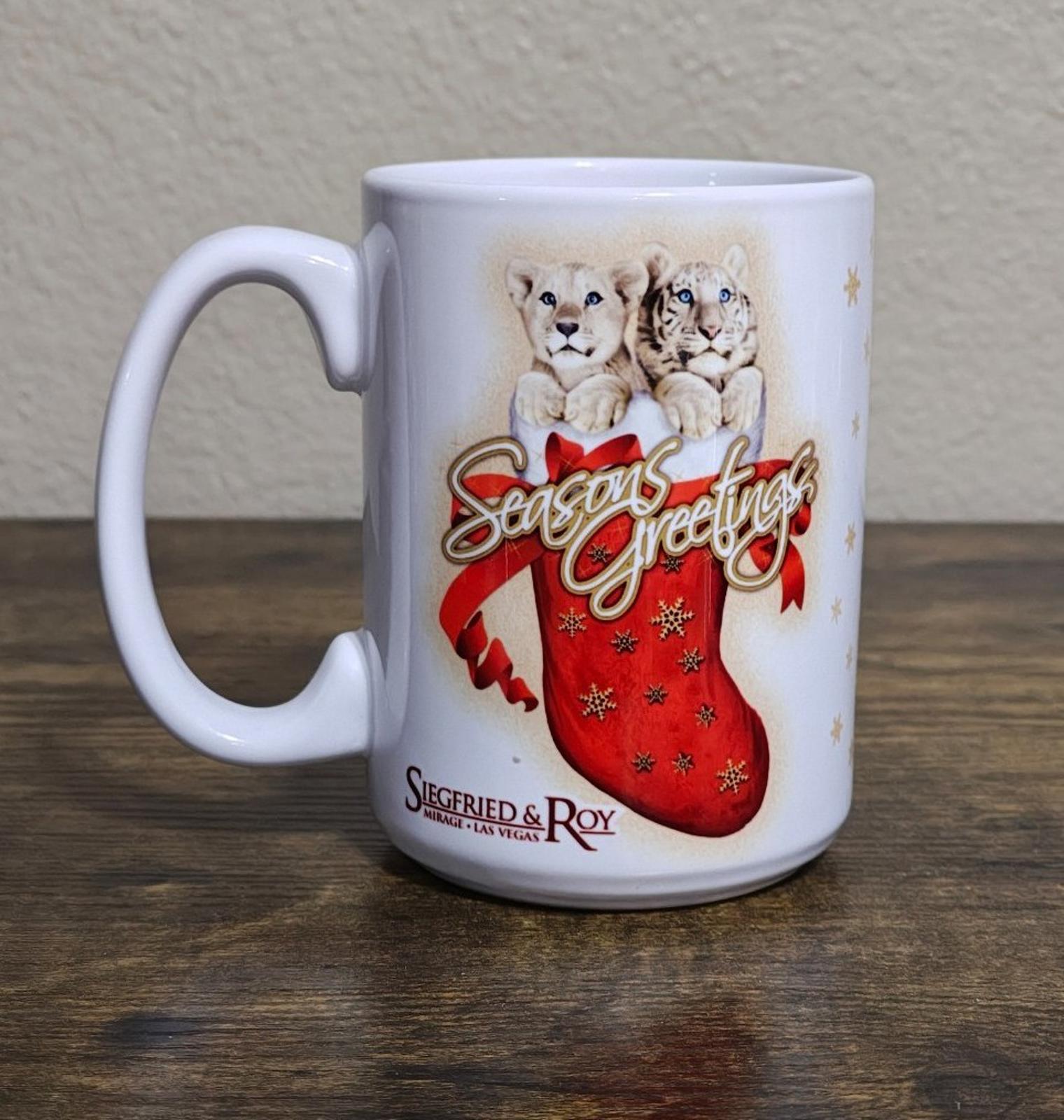 It measures 4.5" tall and 3.25" at the mouth and holds 16 oz. of fluid. This souvenir mug features Siegfried & Roy and the Mirage hotel in Las Vegas. The mug has a holiday theme with the phrase "Seasons Greetings" and an image of two white tiger cubs peeking out of a red stocking. Hand wash recommended. Do not microwave.