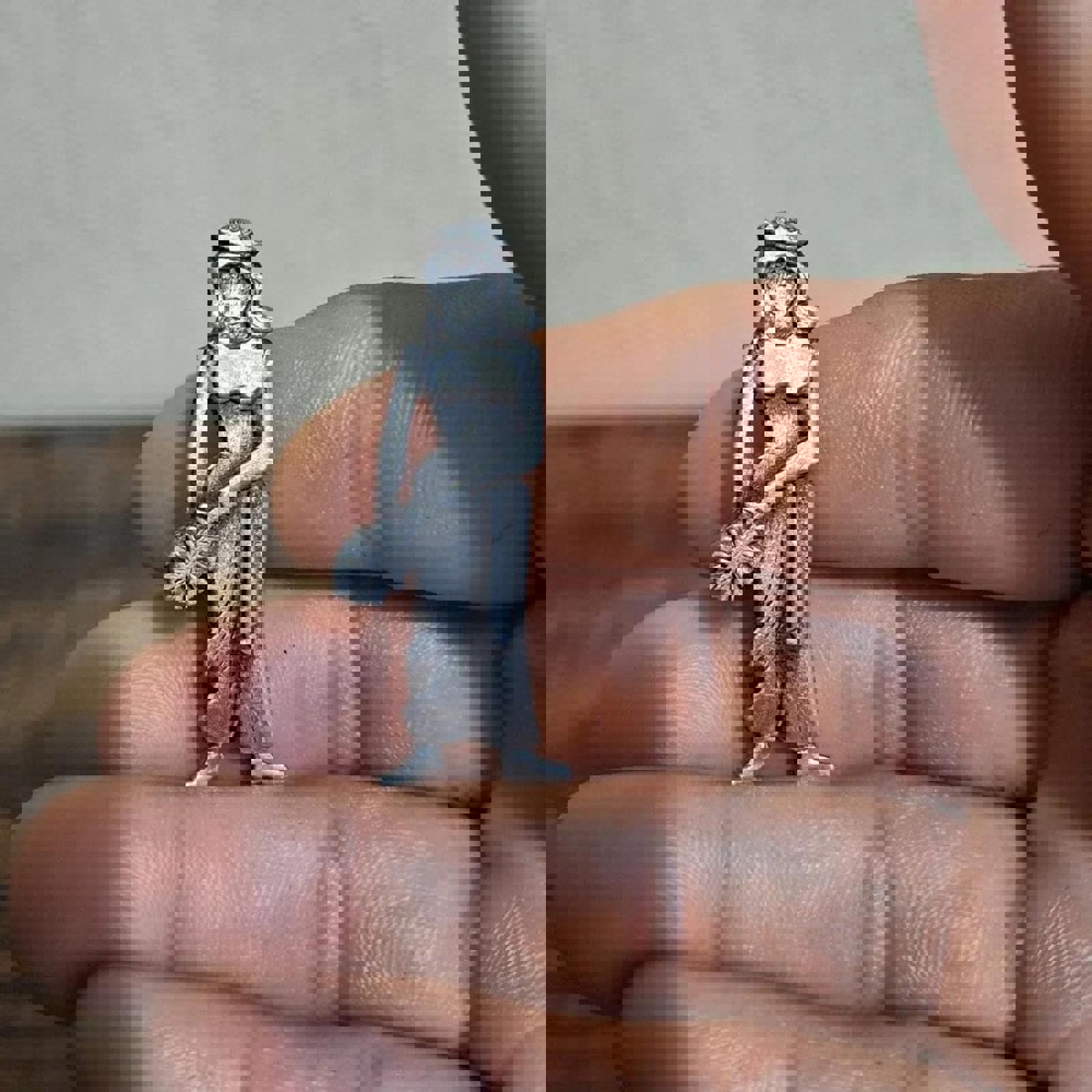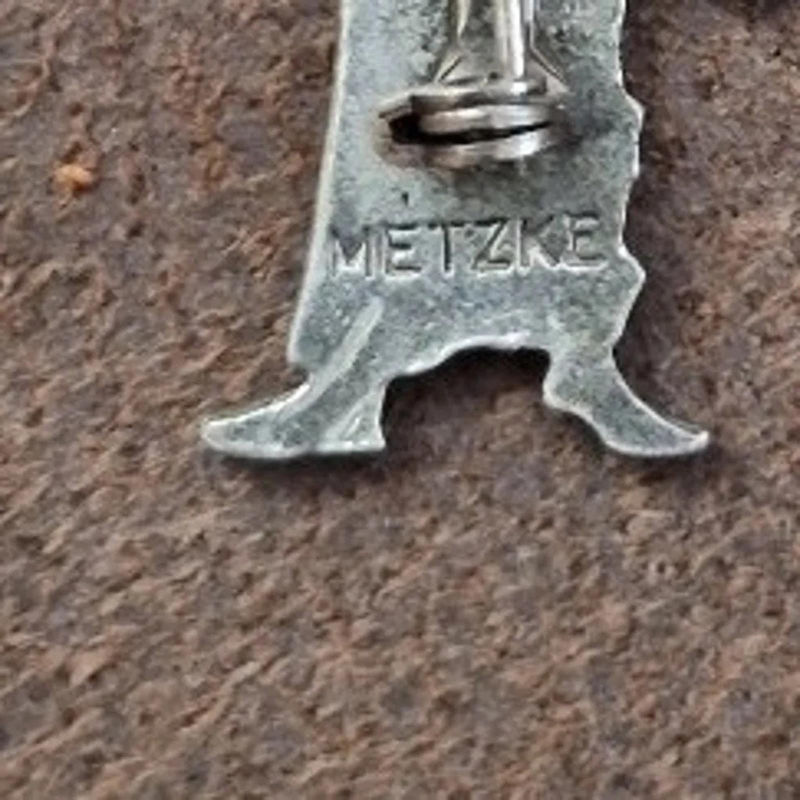 This brooch is just under 2 inches and features a girl in a dress and a crown. The material is pewter and marked Metzke.